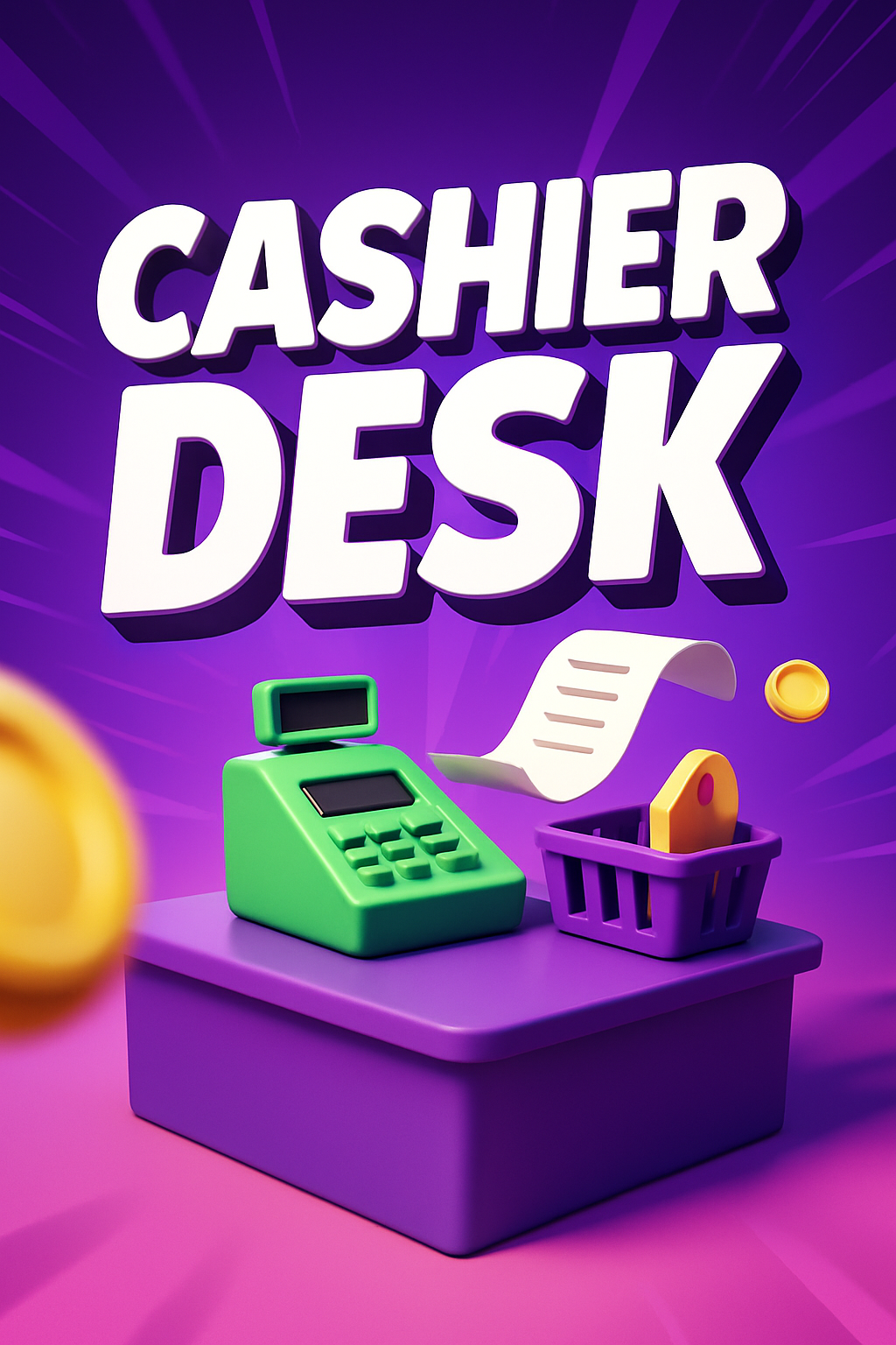 /Collection: /by davooda/Type: PNG/A vibrant illustration of a cashier desk featuring a green register, a shopping basket, and dynamic background lines radiating outward. The color scheme is lively, with a smooth gradient blending into a solid color.