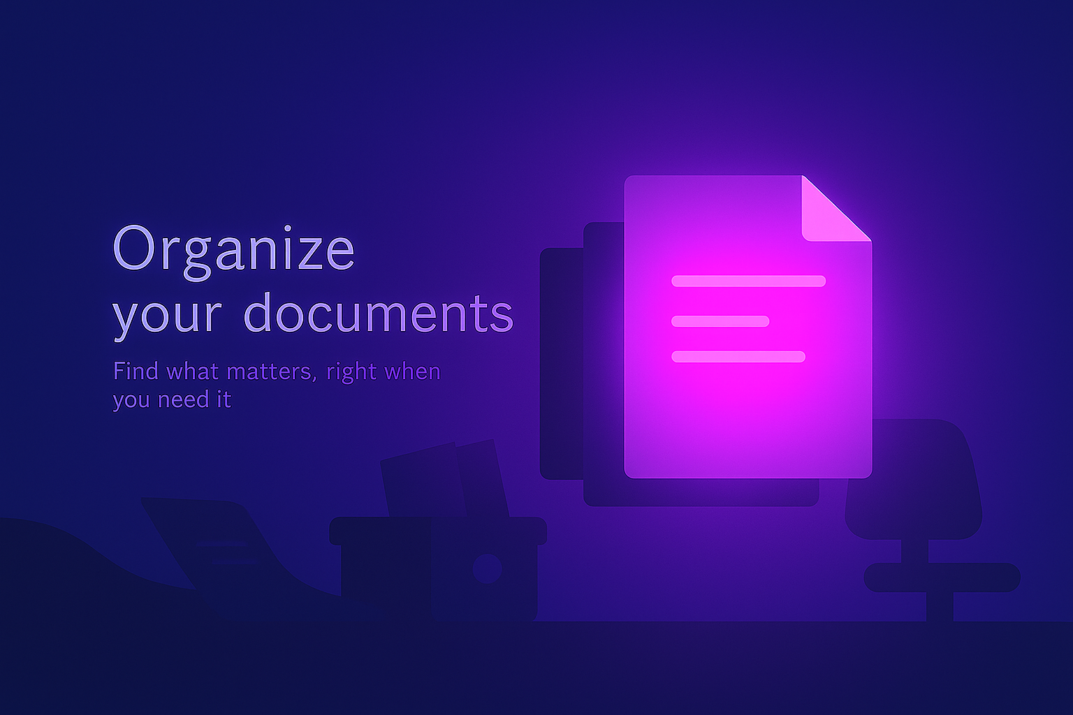 A visually striking composition featuring glowing documents against a blue background. The scene has a neon pink glow, creating an atmospheric feel that emphasizes organization.