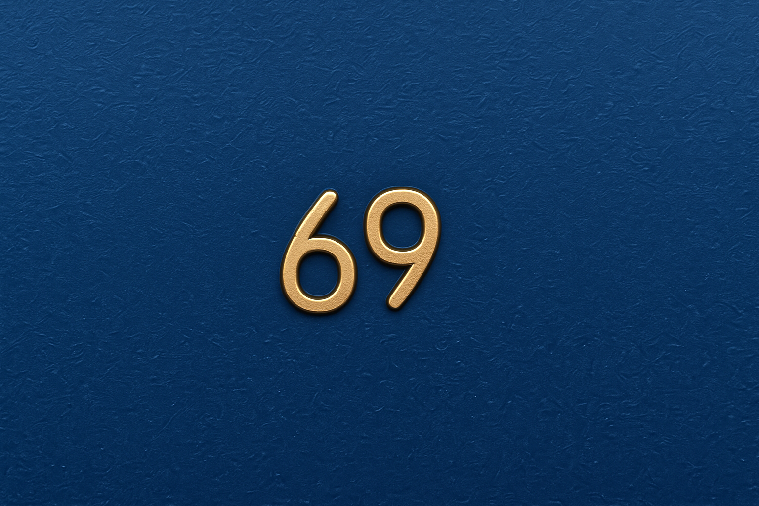 Contemporary graphic featuring the number 69 in a gold color against a textured blue background. Ideal for modern branding or artistic designs.