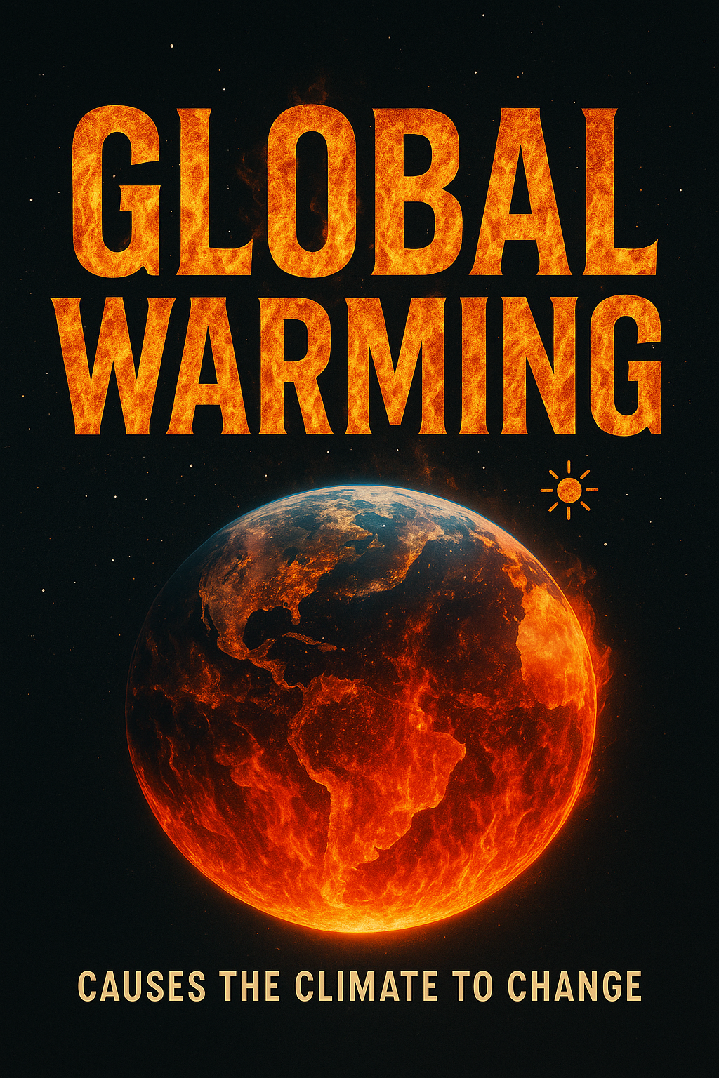 Vivid awareness poster illustrating global warming effects with fiery Earth imagery and bold typography, ideal for environmental campaigns or educational purposes.