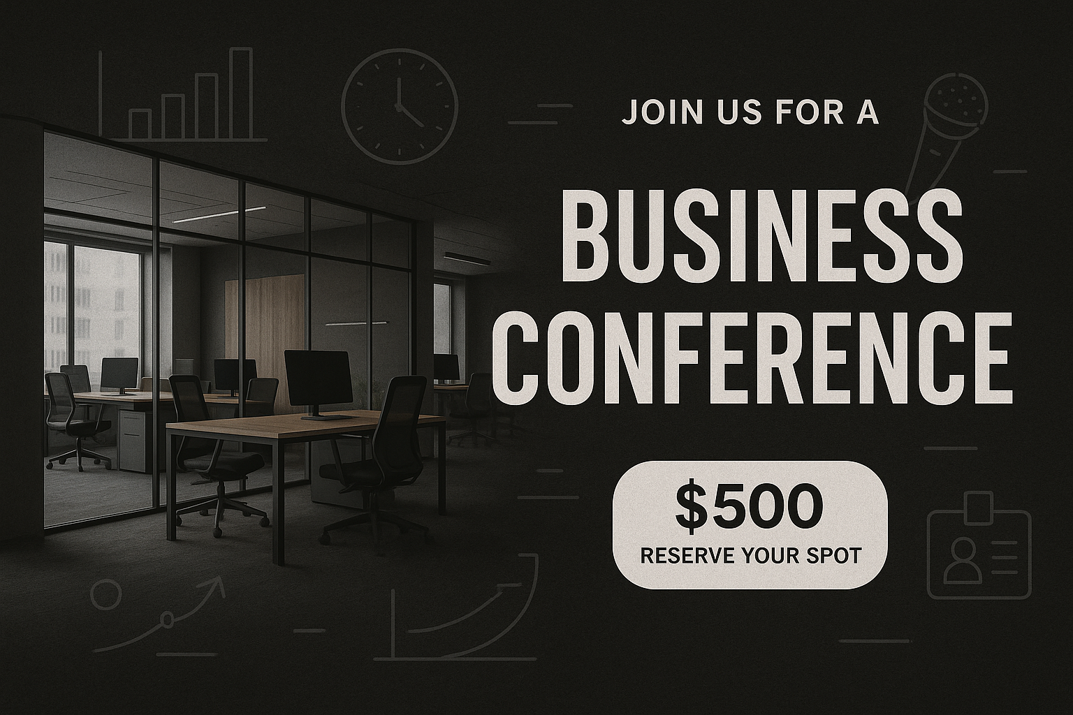 /Collection: /by davooda/Type: PNG/An empty modern office space presented as a backdrop for a business conference invitation. The layout features a dark theme with bold typography and a clear price tag.
