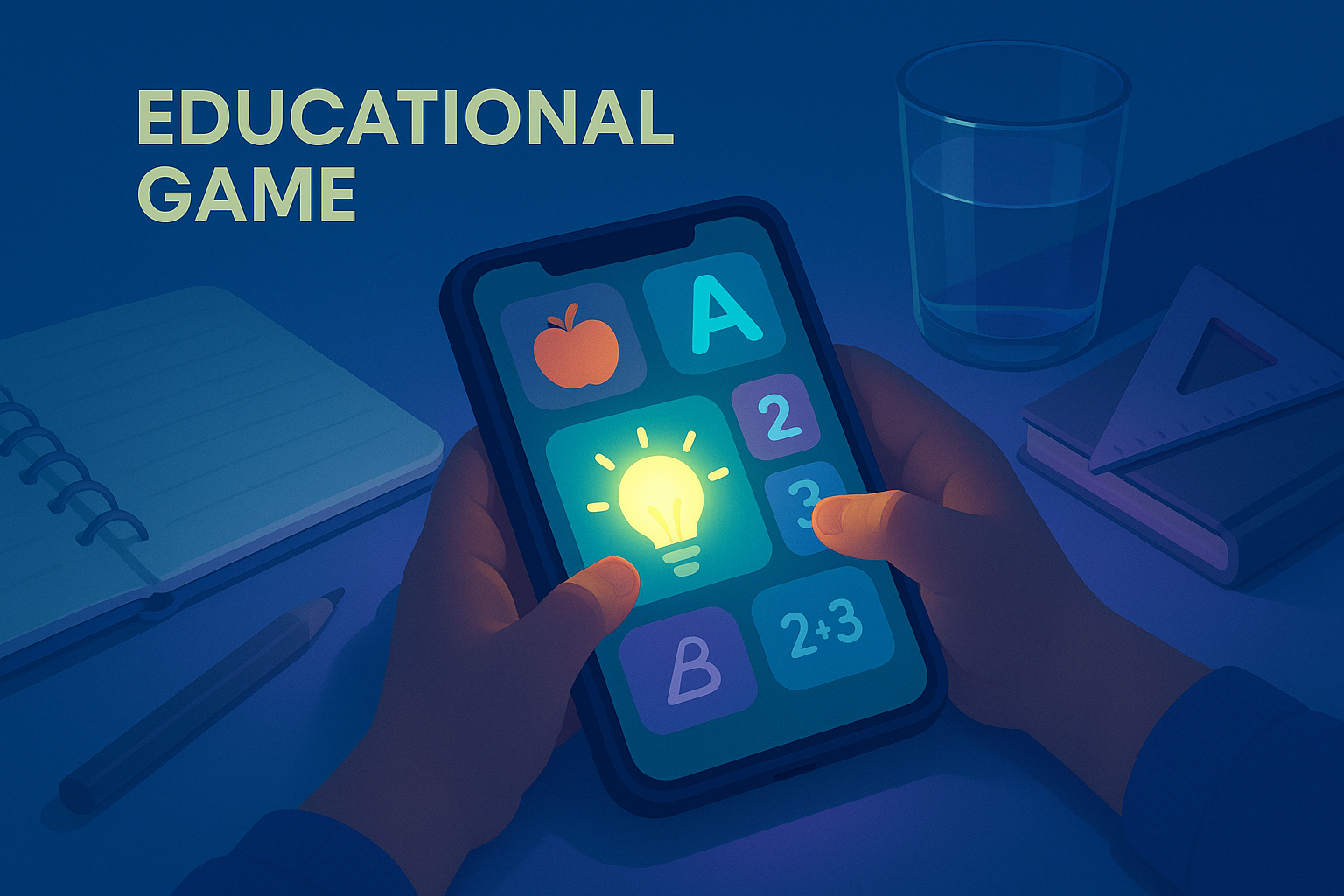 /Collection: /by davooda/Type: PNG/A child's hands interact with a smartphone displaying an educational game. The screen glows softly, illuminating the surroundings while the background is a solid blue. Nearby, a glass and stationery items are visible.