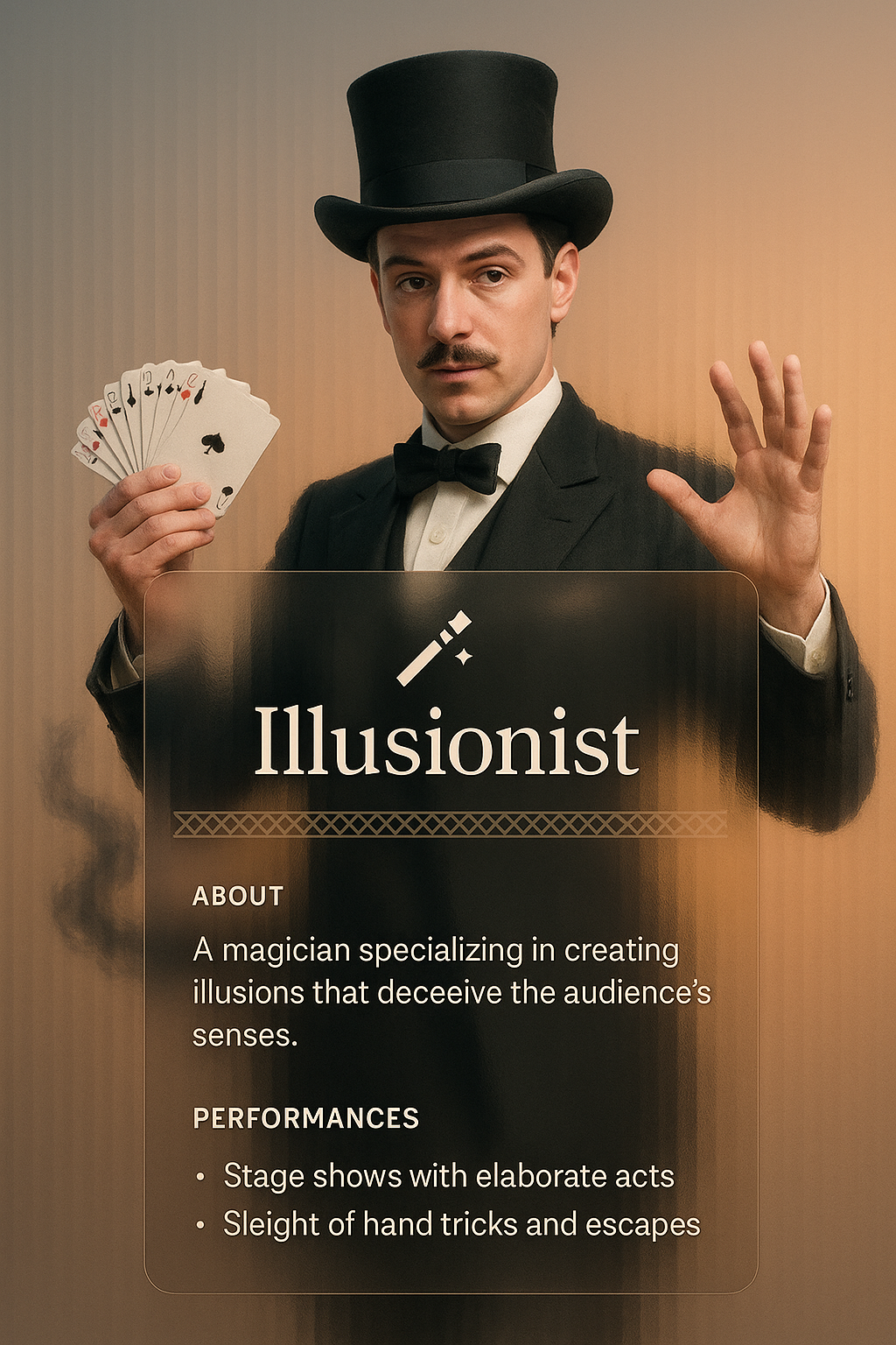 /Collection: /by davooda/Type: PNG/A captivating 3D illustration featuring an illusionist in a formal attire, holding playing cards. The design incorporates transparent elements and layered composition for a sophisticated look.