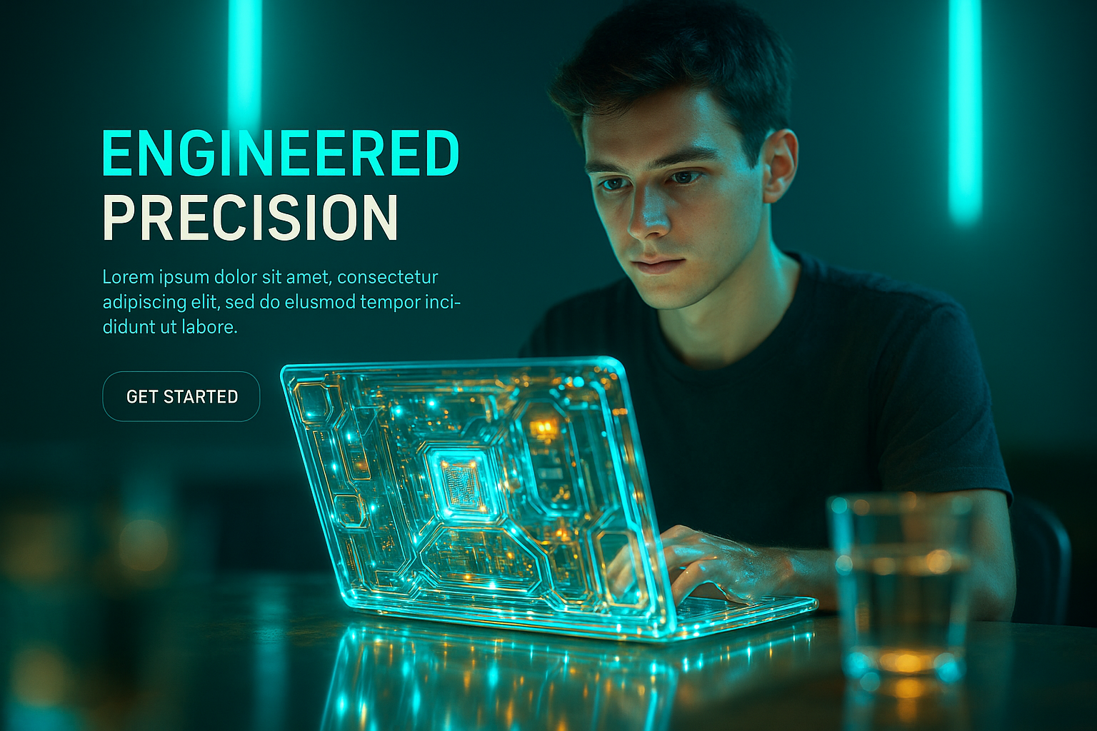 A young man is focused on his laptop in a cafe, surrounded by glowing LED elements. The scene features a soft, cinematic lighting with abstract backgrounds, enhancing the futuristic atmosphere.