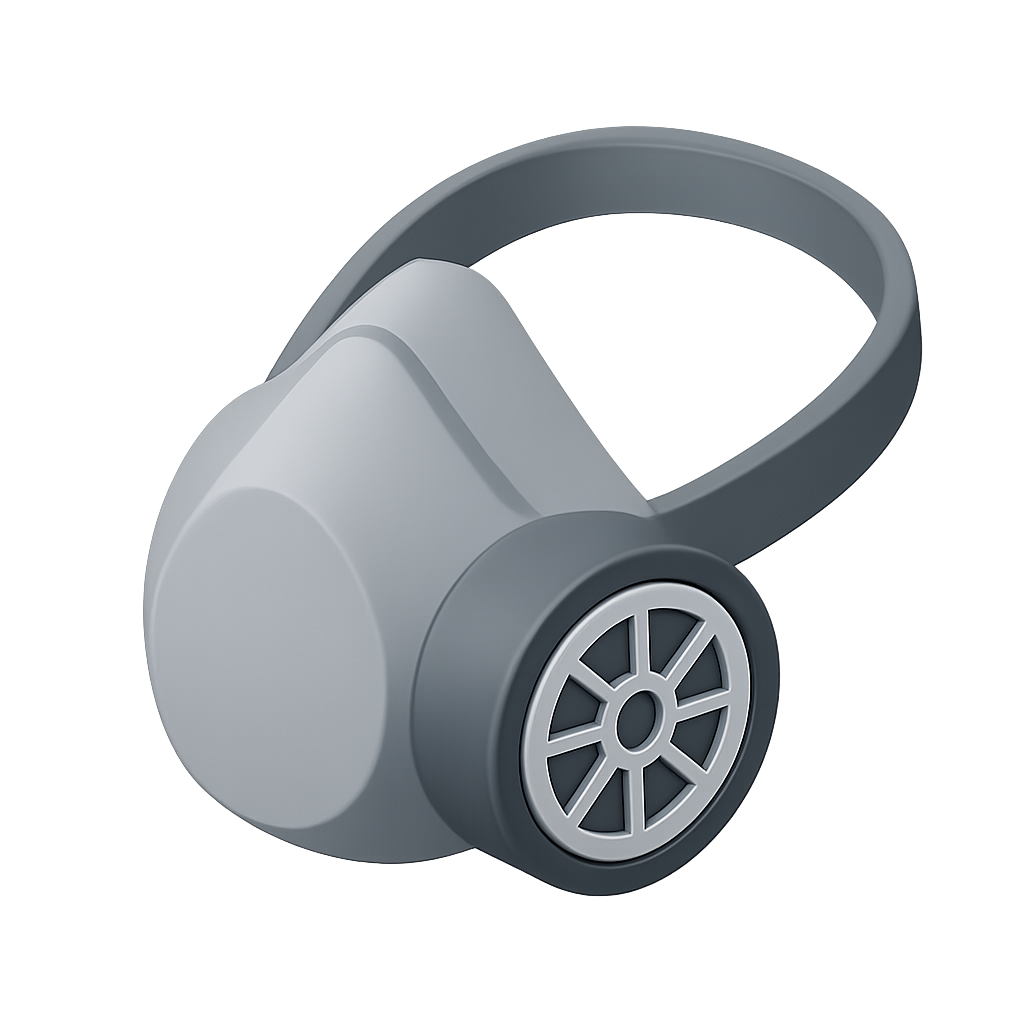 A stylized 3D representation of a dust mask with a filter, shown in a three-quarter isometric view. The design features a smooth surface and a circular filter detail.