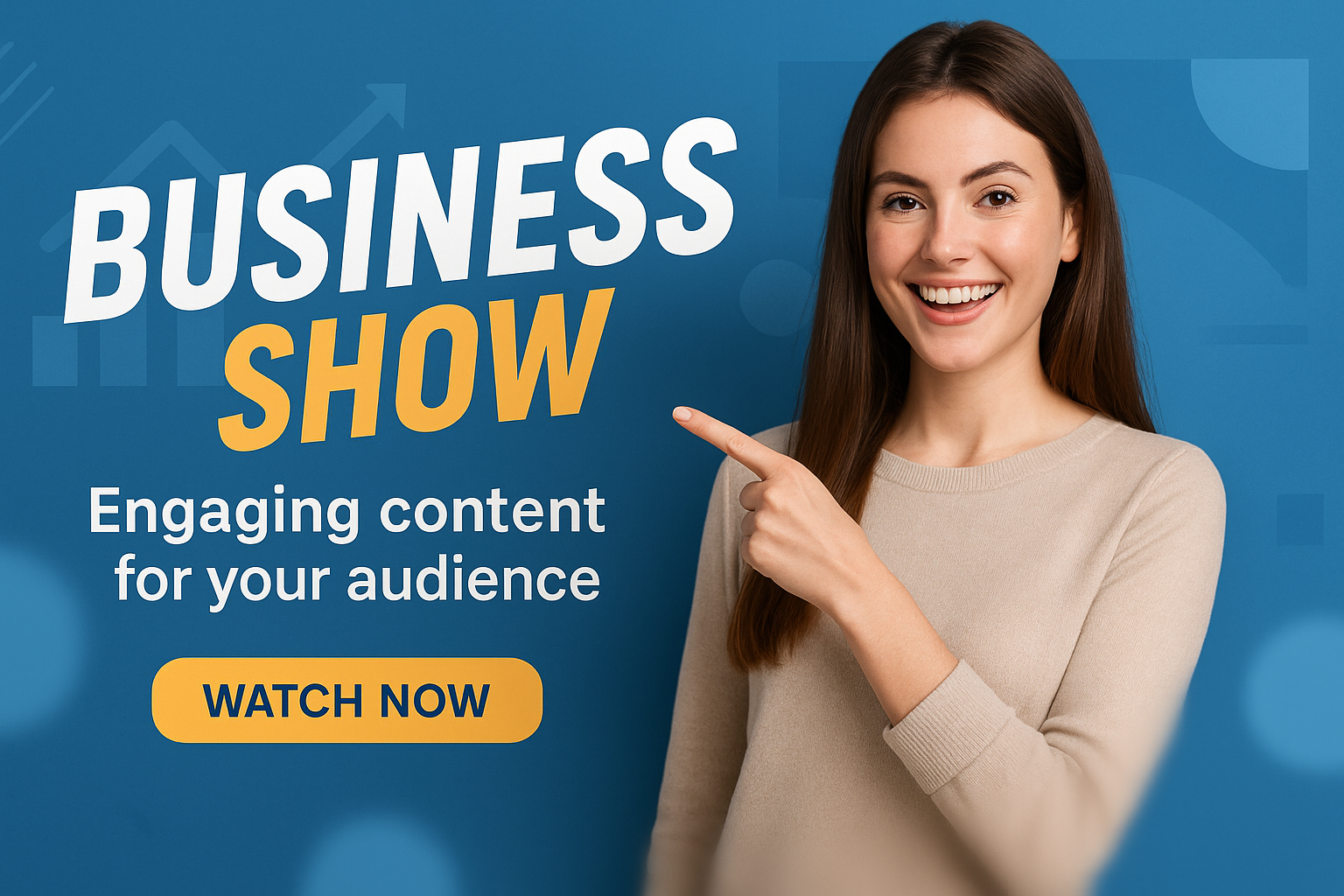/Collection: /by davooda/Type: PNG/A vibrant promotional image for a business show, featuring a smiling woman pointing towards the text. Ideal for social media marketing and audience engagement.