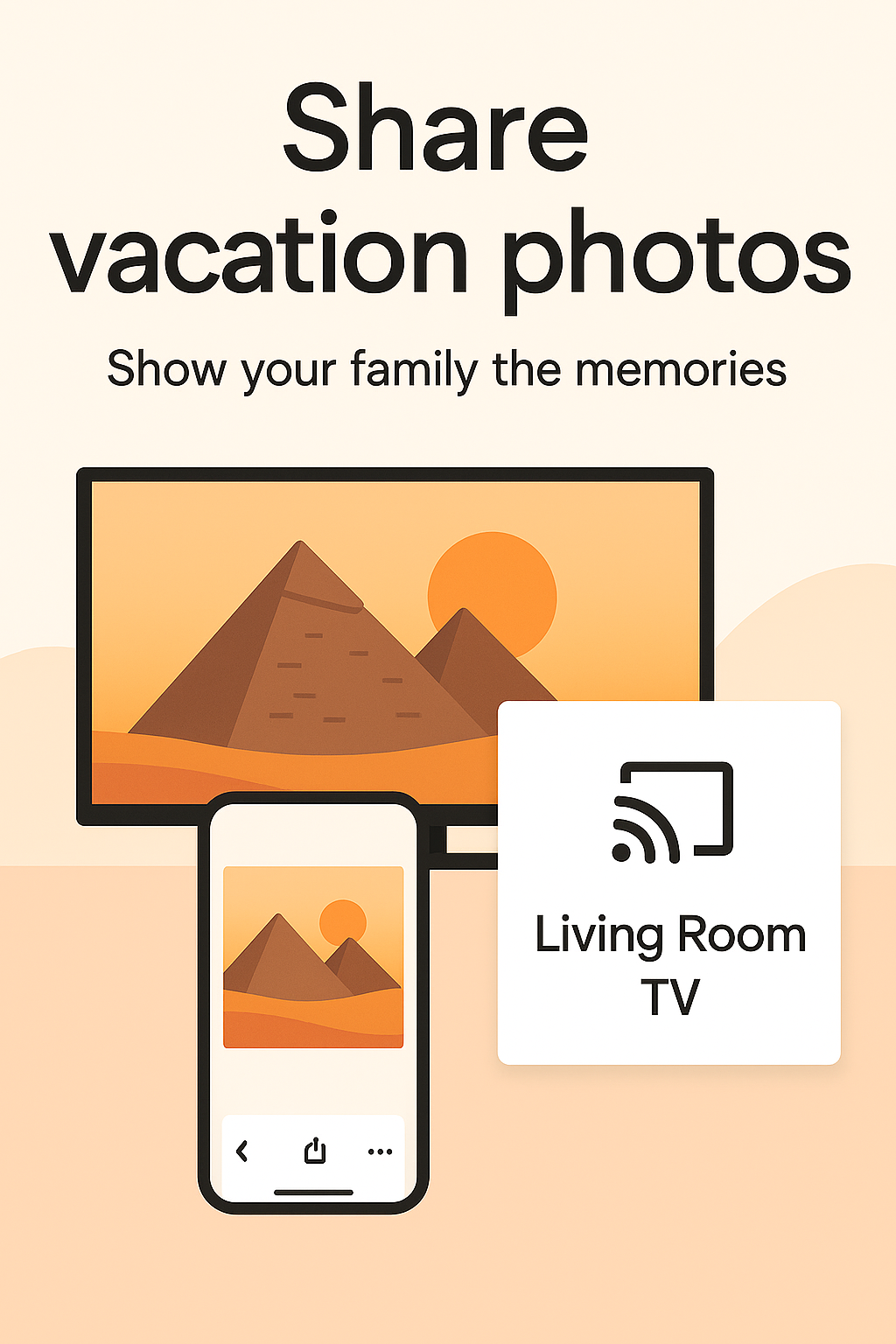 A digital graphic showcasing devices sharing vacation memories, featuring warm colors and a minimalist design, ideal for social media or app promotion.