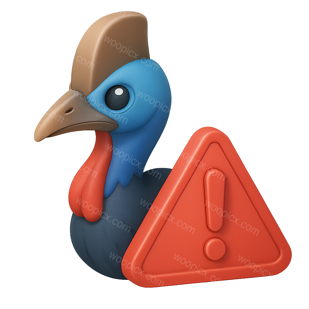 A stylized 3D icon of a cassowary with a bright blue head and red warning triangle. The isometric design adds depth, making it visually striking.