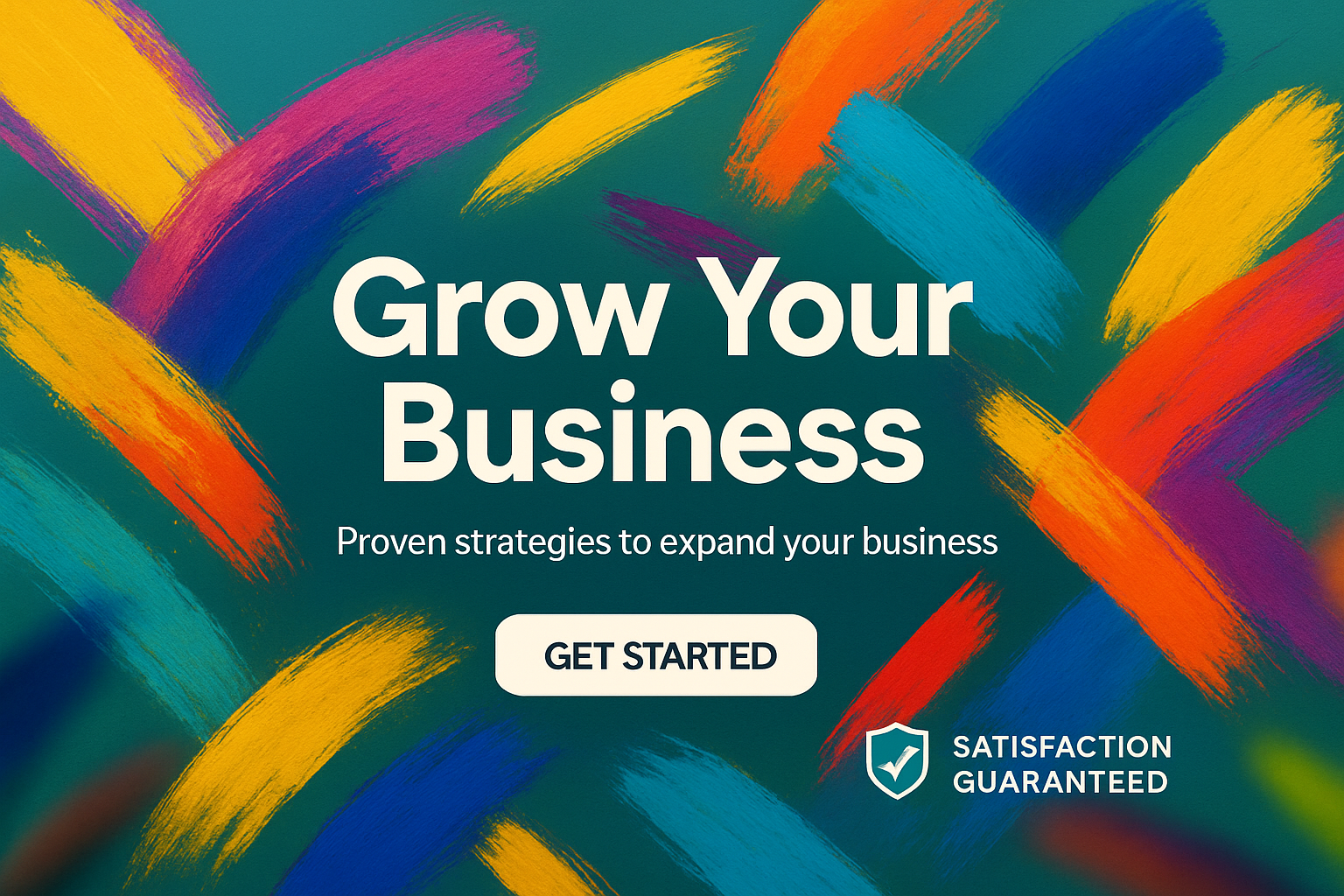 This colorful banner promotes business growth strategies, featuring a dynamic design with a bold call to action. Ideal for social media or website use.