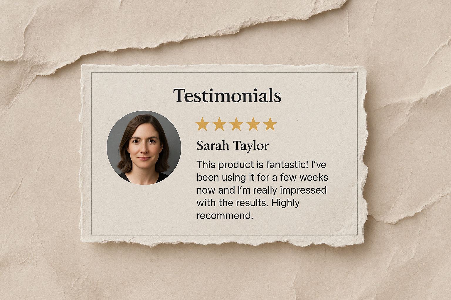 A visually appealing testimonial block featuring a circular photo of a woman, her name, and a five-star rating. The textured background resembles realistic paper rips, enhancing the design.