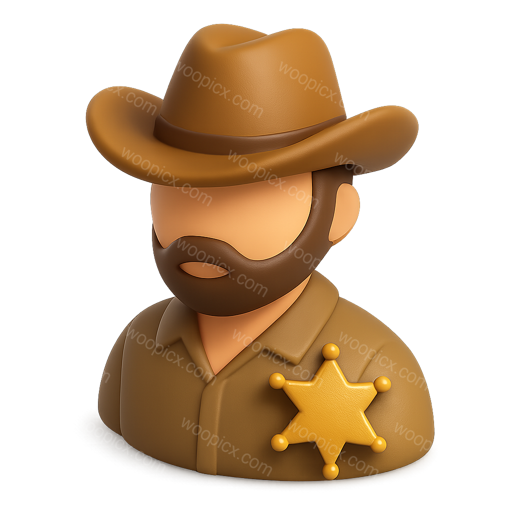 A 3D representation of a sheriff featuring a star badge. The character wears a cowboy hat and has a stylized beard, set against a gradient background for depth.