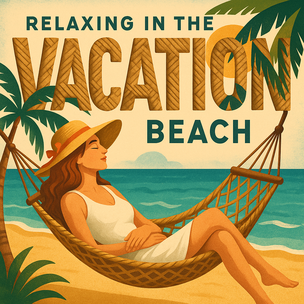 /Collection: /by davooda/Type: PNG/A vibrant illustration depicting a woman relaxing in a hammock on a beach, surrounded by palm trees. Ideal for travel or vacation-themed content.