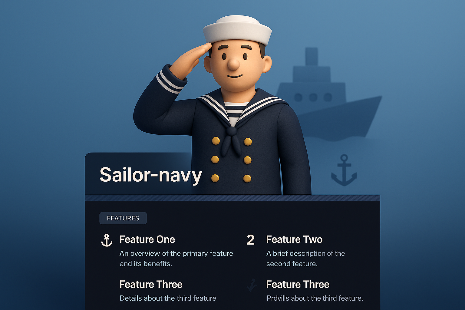/Collection: /by davooda/Type: PNG/A 3D sailor character is depicted saluting, with a dark overlay featuring descriptions of three features. The background smoothly transitions from a gradient to a solid color, enhancing the visual depth.
