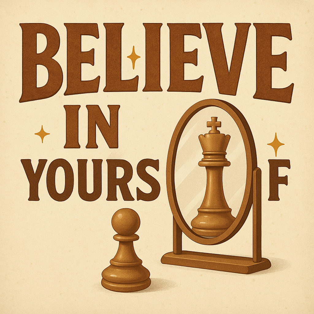 Creative illustration featuring a chess piece and a mirror, symbolizing self-belief and potential. Ideal for motivational content and chess enthusiasts.