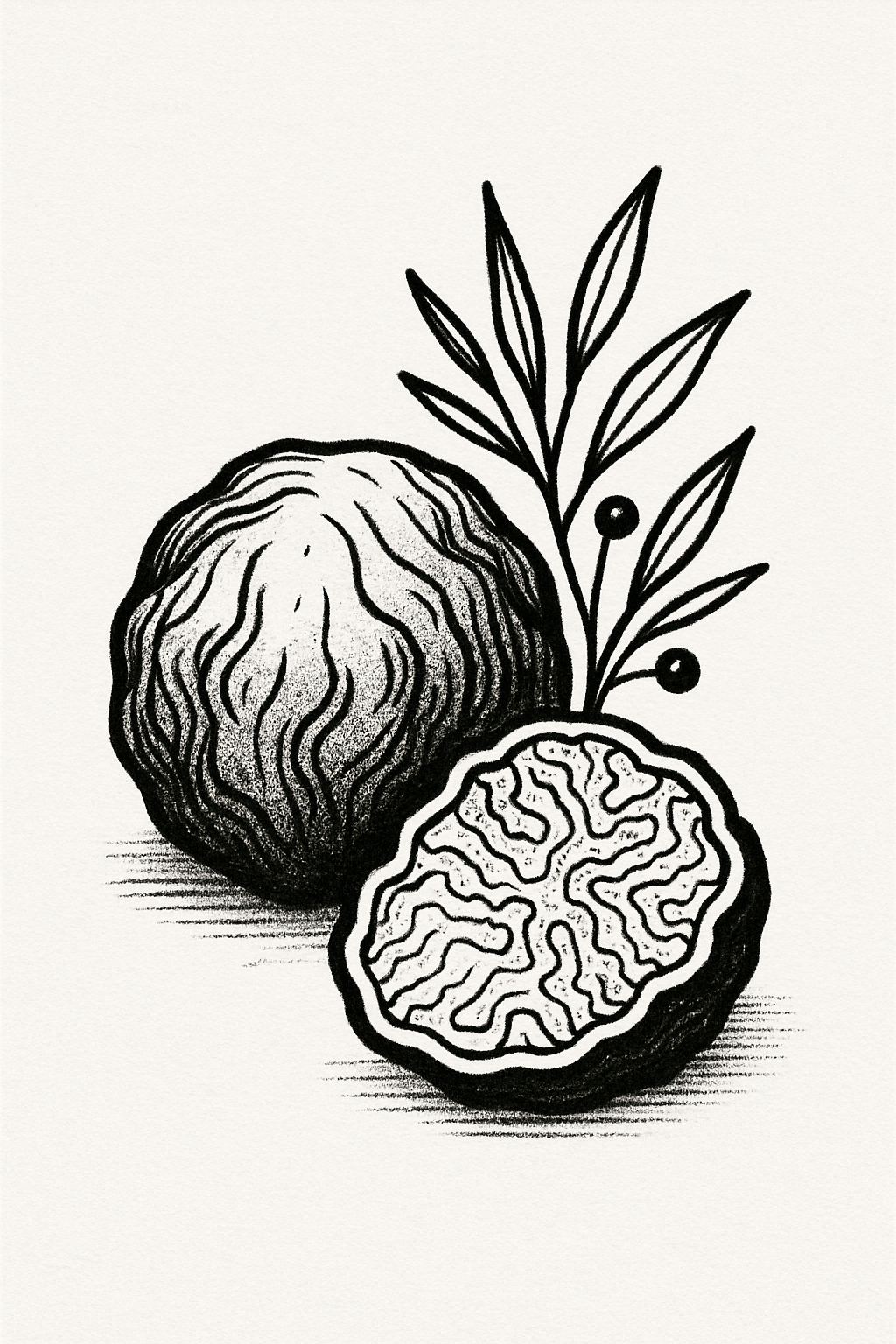 This image features a stylized illustration of nuts, with one whole and one halved, accompanied by botanical leaves. It serves as a decorative graphic for food-related content.