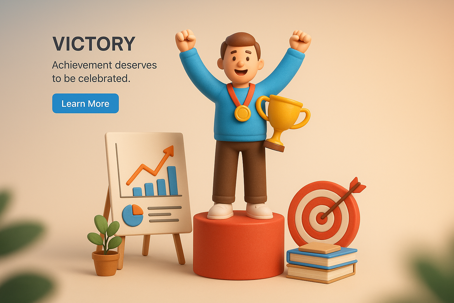 /Collection: /by davooda/Type: PNG/A detailed 3D illustration depicting a joyful character celebrating victory with a trophy. Surrounding elements include a chart, a target, and books, all designed in a cohesive, colorful style.