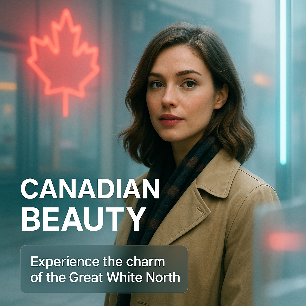 /Collection: /by davooda/Type: PNG/A visually appealing promotional image showcasing a woman in a stylish coat, with a neon maple leaf in the background, perfect for tourism marketing focused on Canada.