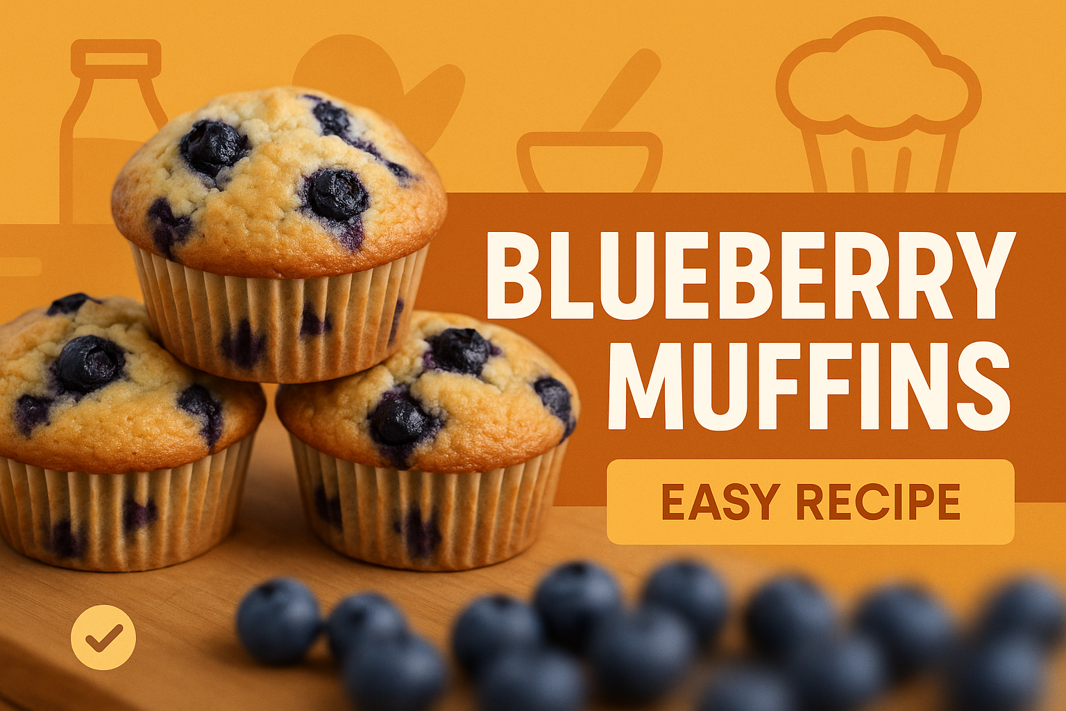 Inviting recipe graphic showcasing freshly baked blueberry muffins, perfect for food blogs or cooking websites. Features warm colors and appealing design.
