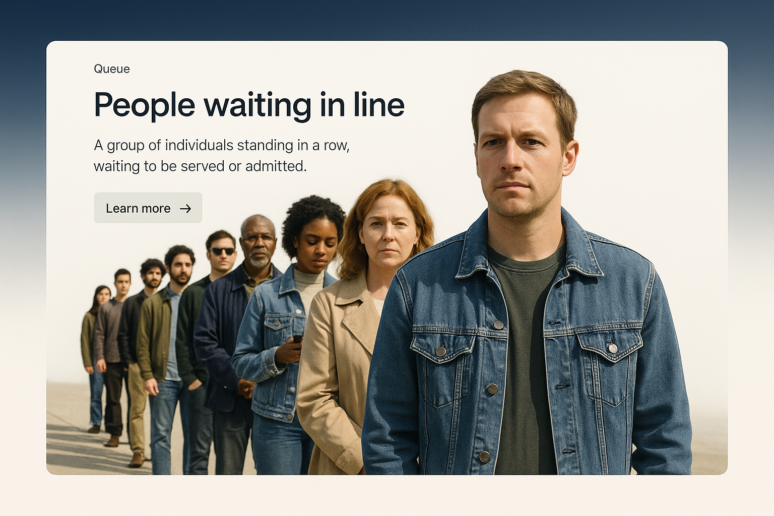 A web page design showcasing a queue of individuals waiting in line. The layout includes a small label, a brief headline, and a text block with a call-to-action button, all set against a gradient background.