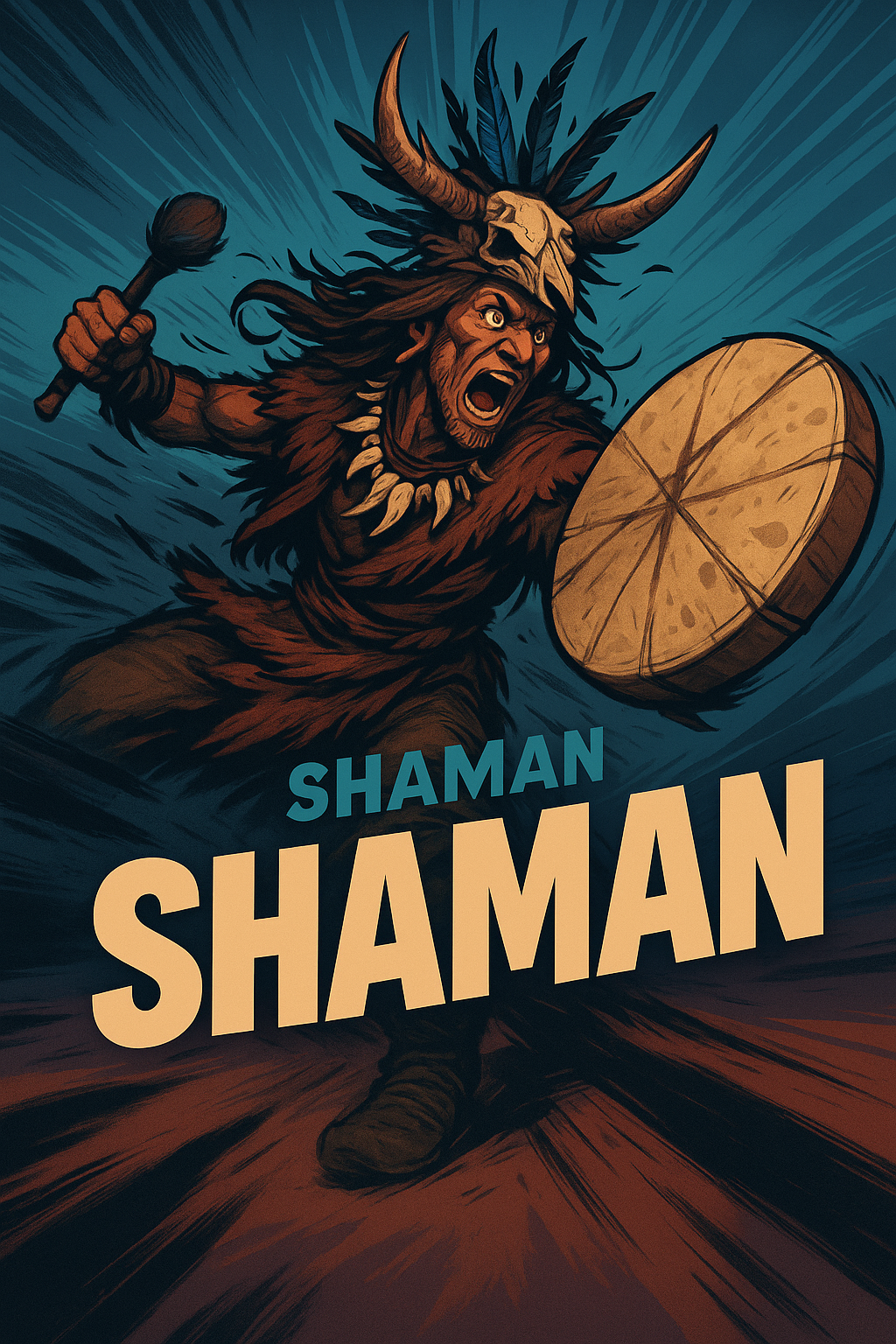 A dynamic illustration of a shaman wielding a drum, set against a vibrant blue background. Bold typography emphasizes the word 'SHAMAN' in an engaging style.