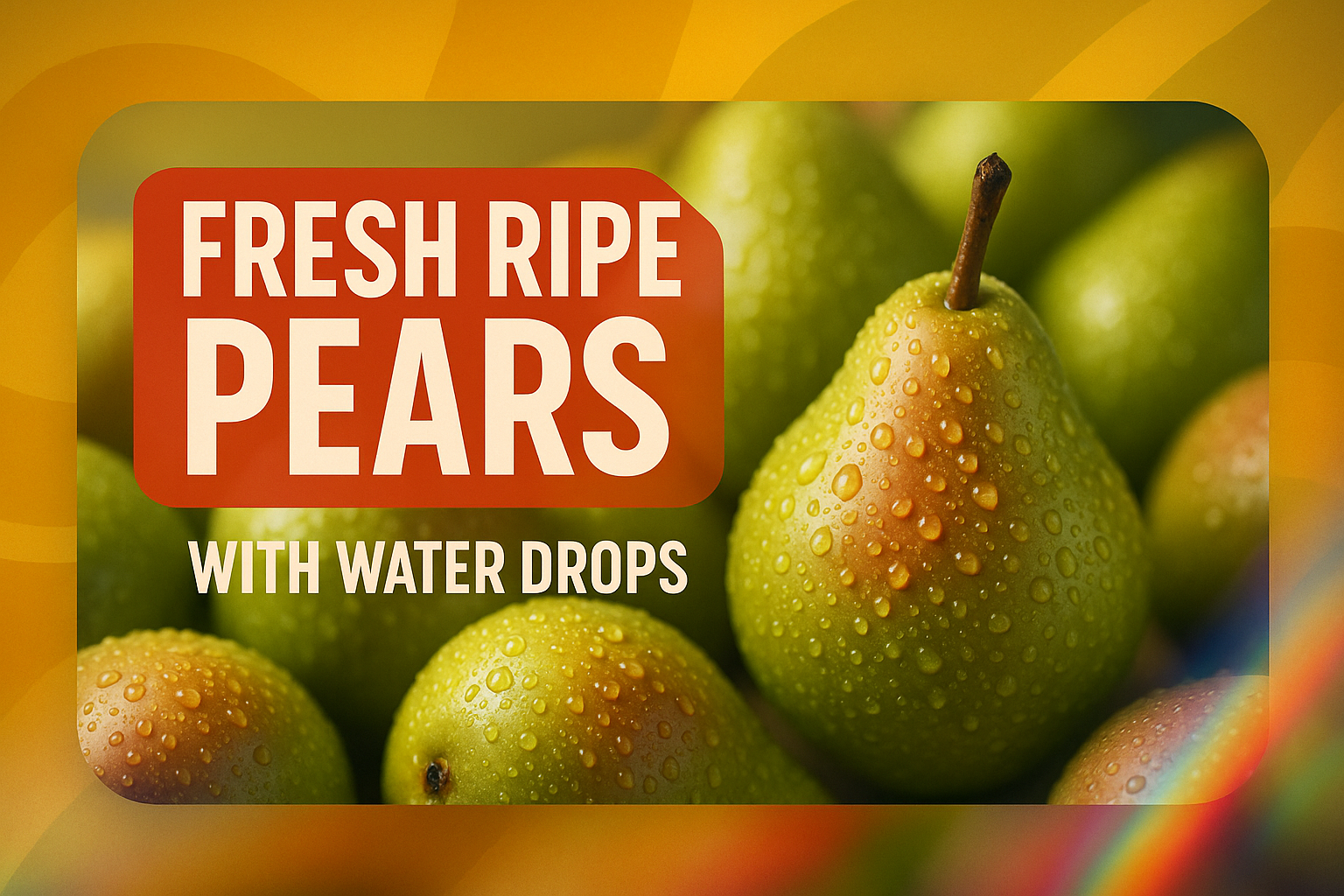 A colorful image showcasing fresh ripe pears with water droplets, ideal for food marketing or healthy lifestyle promotions. The design features bright colors and appealing textures.