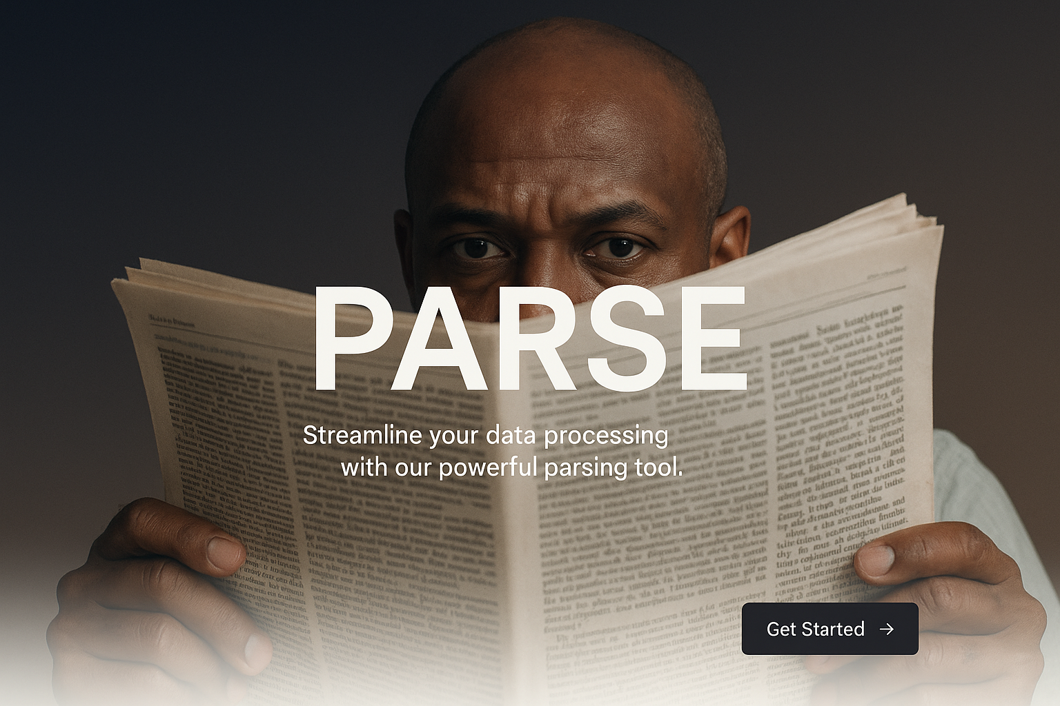 /Collection: /by davooda/Type: PNG/A modern web page design showcasing a data processing tool called 'PARSE'. The layout features a prominent headline, supporting text, and a call-to-action button, all set against a gradient background.