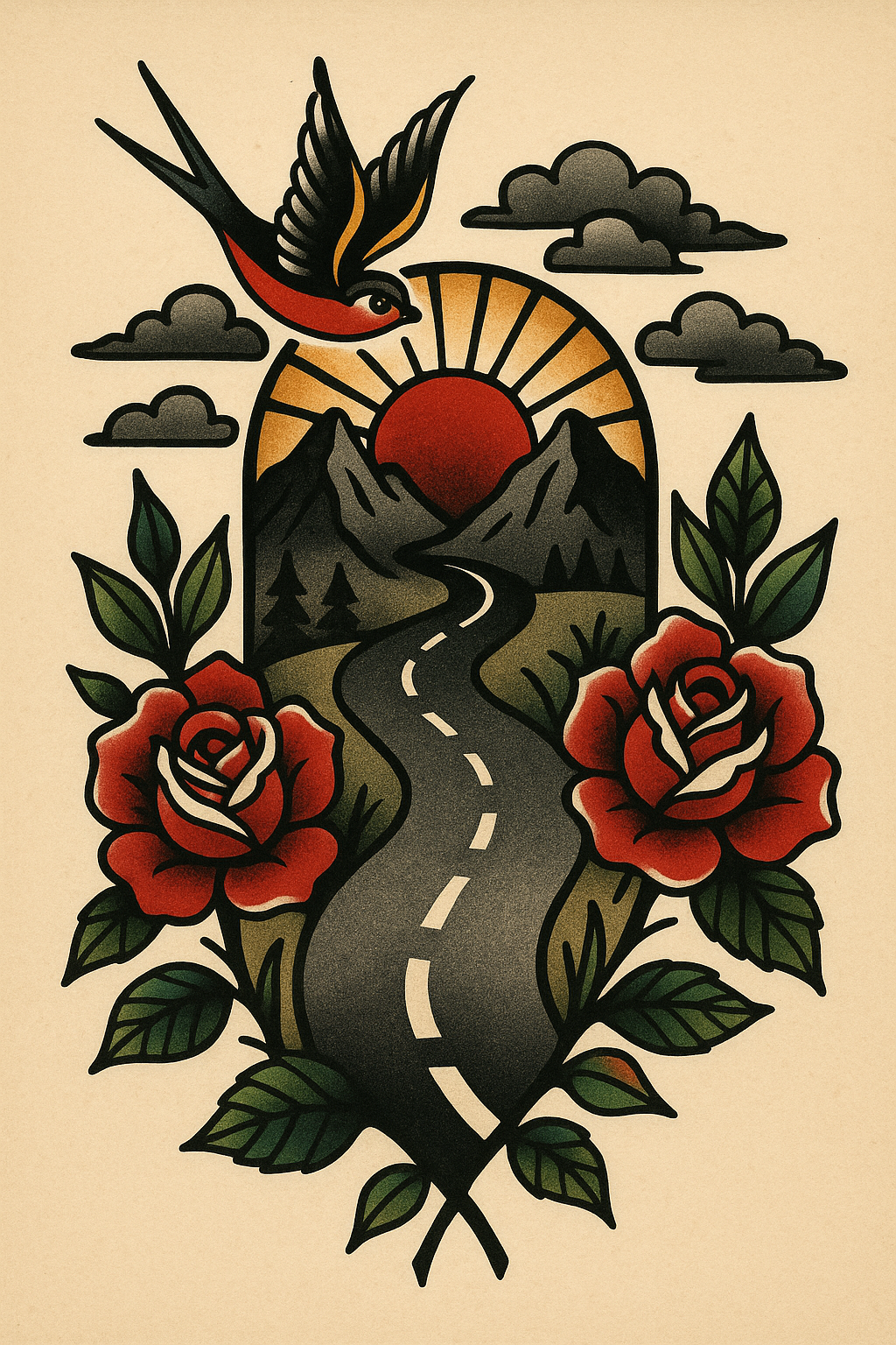 This image showcases a tattoo art style featuring a winding road, mountains, and flowers. It combines elements of nature with vibrant colors, appealing to tattoo enthusiasts and art lovers.