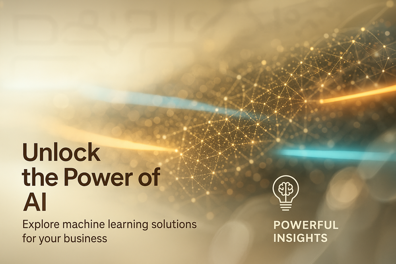 Modern promotional graphic highlighting AI and machine learning solutions. The design features a blend of abstract elements and glowing lines, appealing to tech-savvy businesses.