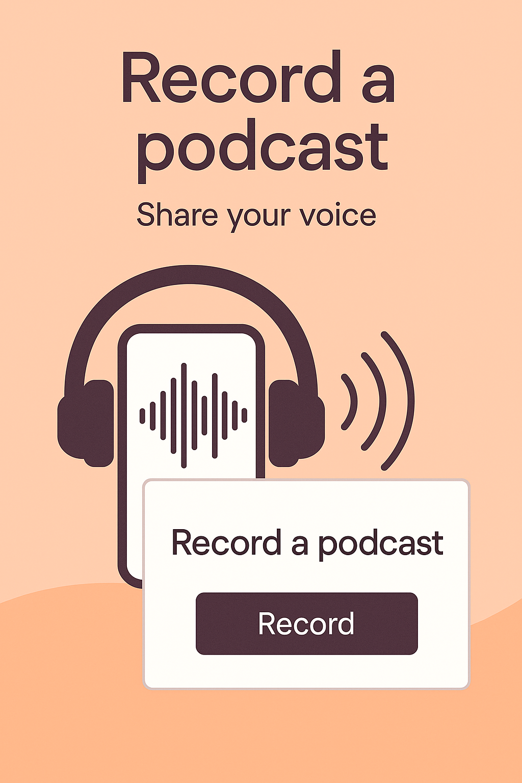 A modern graphic promoting podcast recording, featuring a smartphone with headphones and soundwave visuals, ideal for digital content marketing.