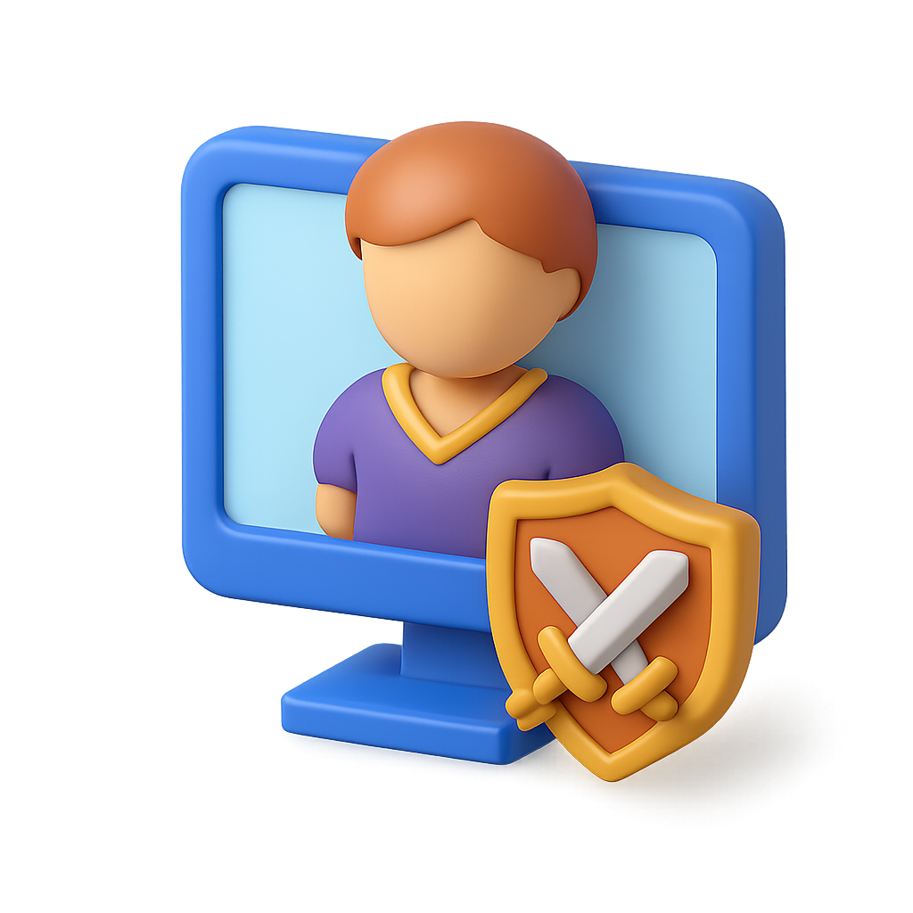 A colorful 3D icon featuring a character on a computer screen alongside a shield with crossed swords, all presented in a three-quarter view with a transparent background.
