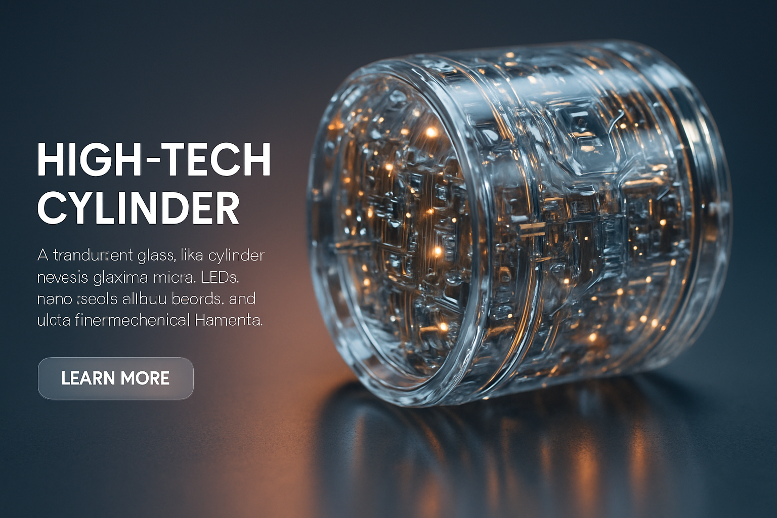 /Collection: /by davooda/Type: PNG/A hyperrealistic 3D close-up of a glass-like cylinder showcasing glowing micro-LEDs and intricate mechanical components, illuminated with stylish soft lighting.