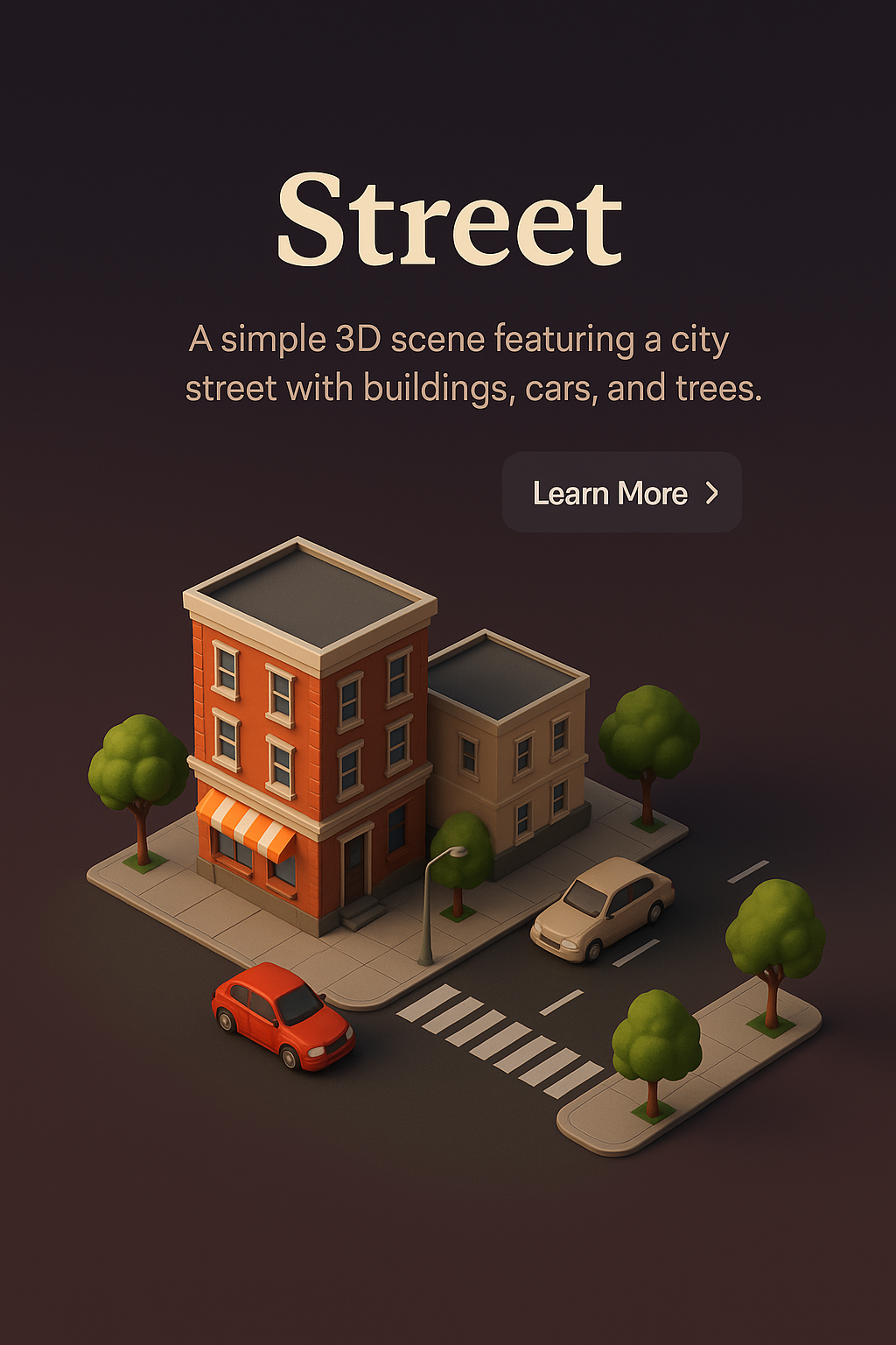 A detailed 3D scene depicting a city street with buildings, cars, and trees, featuring a dark gradient background and elegant typography for a modern look.