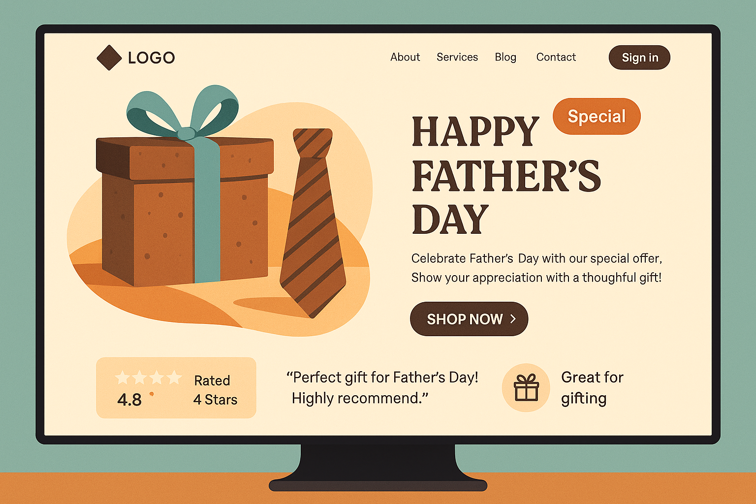A visually appealing landing page design celebrating Father's Day, featuring a gift box and tie, with a clean layout and engaging elements.