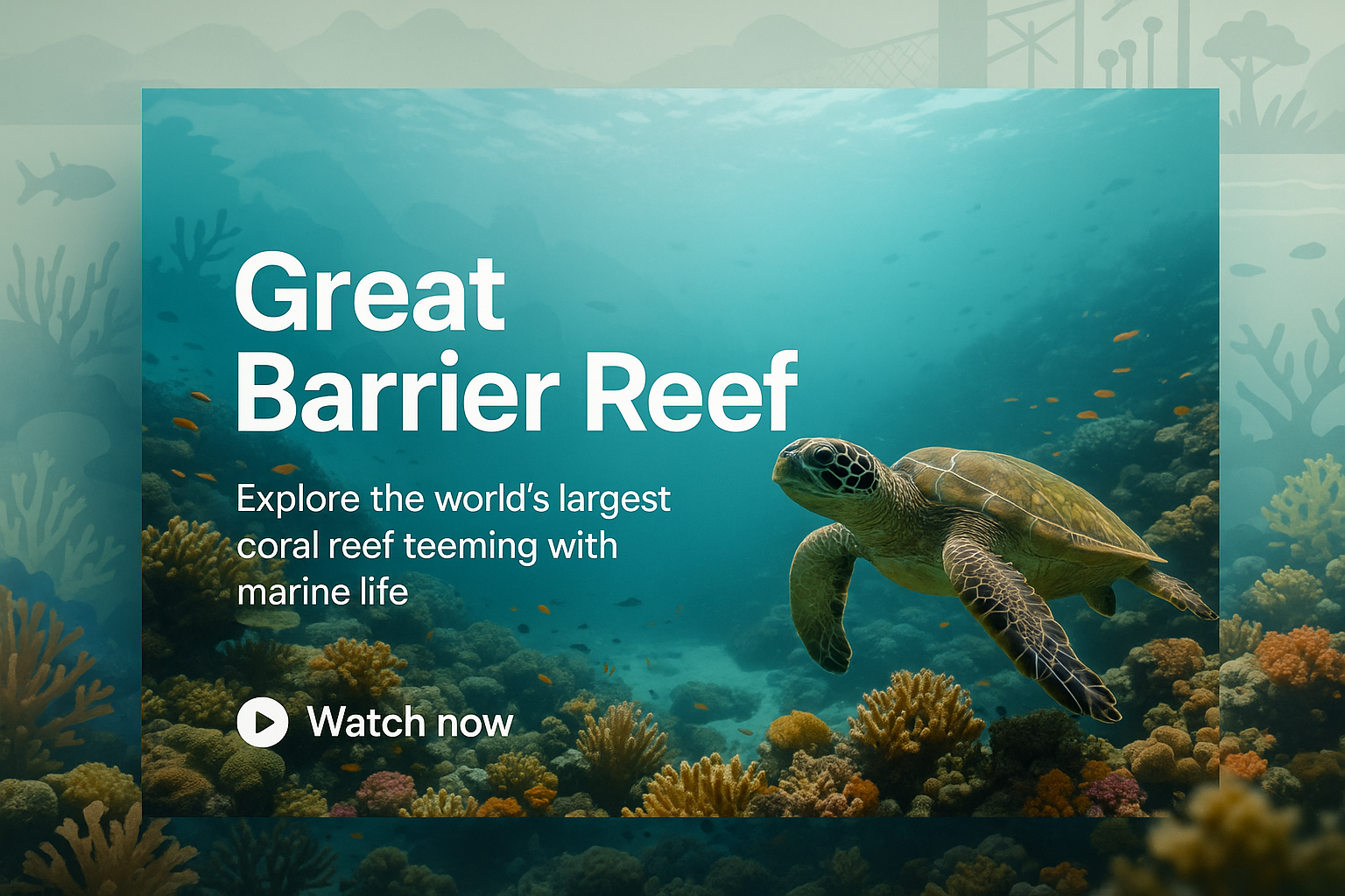 /Collection: /by davooda/Type: PNG/Engaging promotional graphic highlighting the Great Barrier Reef, featuring an underwater scene with a turtle, suitable for marine life conservation campaigns or educational content.