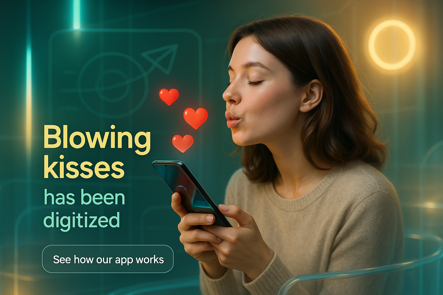 A modern promotional image illustrating a woman blowing kisses while using a smartphone, symbolizing digital communication and affection. Ideal for app marketing targeting young audiences.