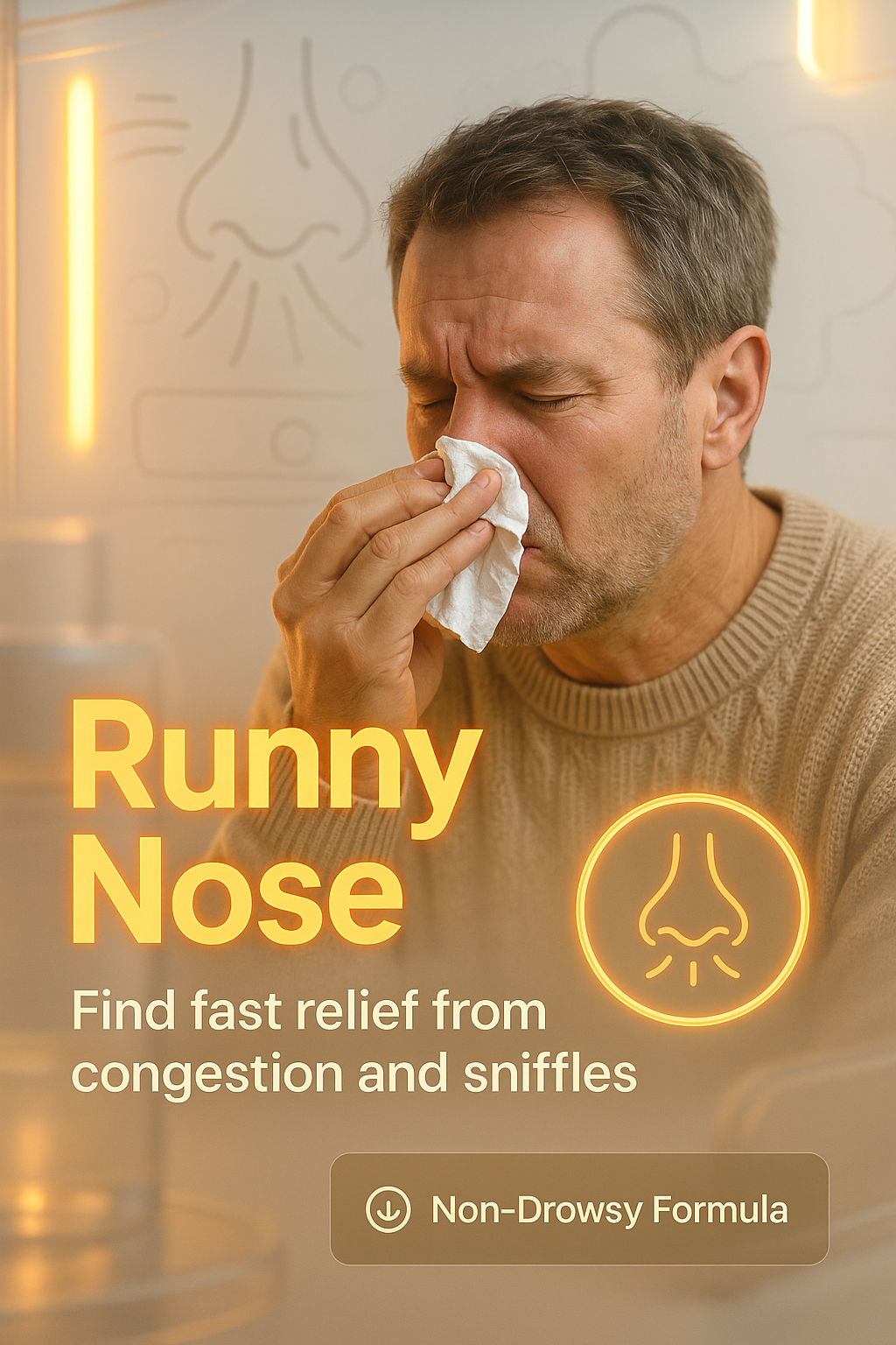 Visually appealing health advertisement focusing on quick relief for runny noses, featuring a person experiencing symptoms. Ideal for pharmacy promotions.