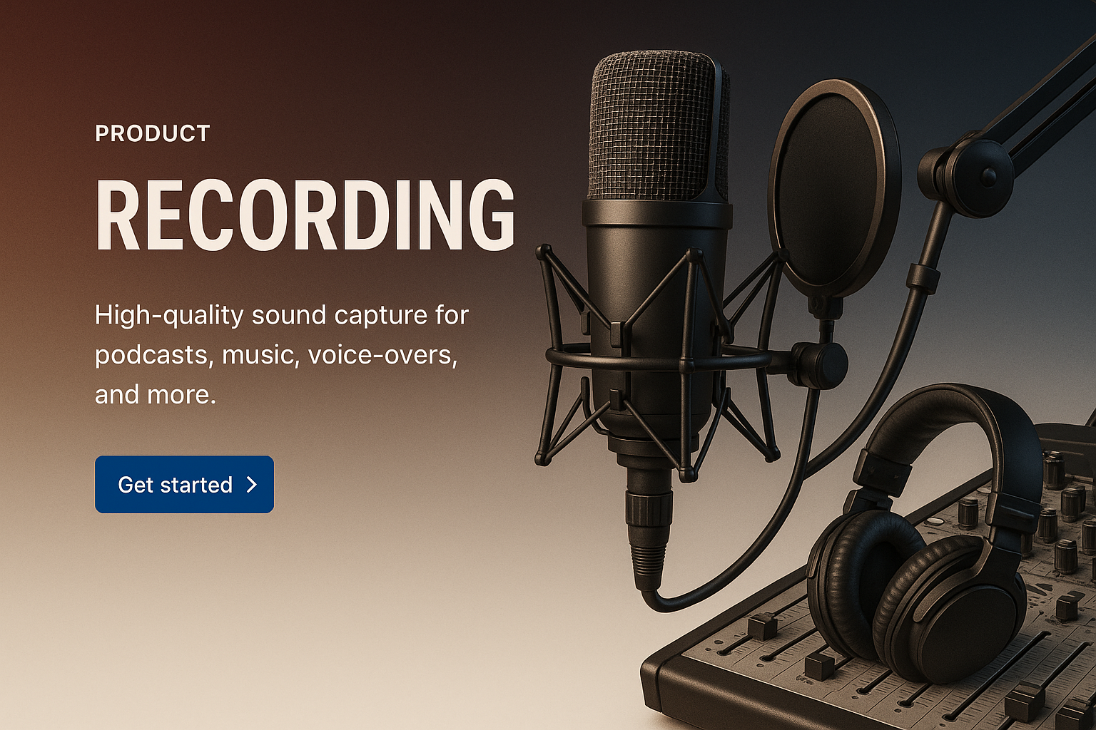 A visually appealing web design showcasing a microphone and audio equipment, emphasizing the recording theme. Features a sleek gradient background and clear call-to-action.