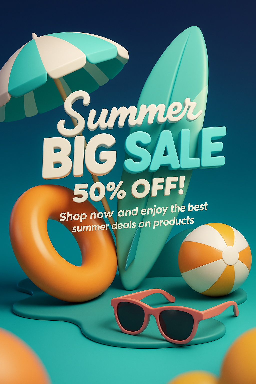 A vibrant 3D illustration showcasing a summer sale theme. Key elements include a surfboard, beach ball, and sunglasses with a bold title and engaging visuals.