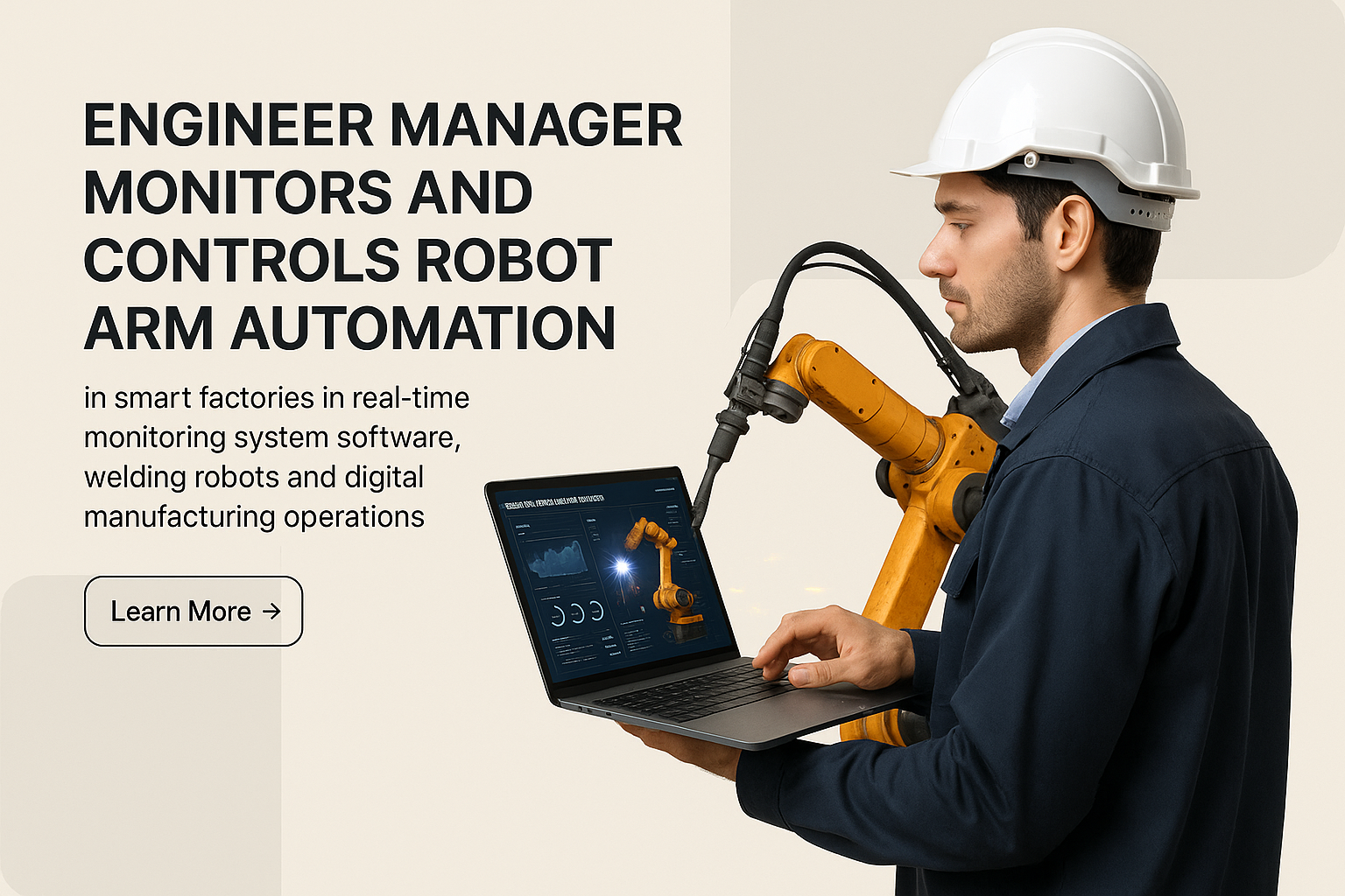 An engineer manager monitors and controls a robotic arm in a smart factory setting. The clean, modern layout features bold typography and a well-composed design emphasizing clarity and professionalism.