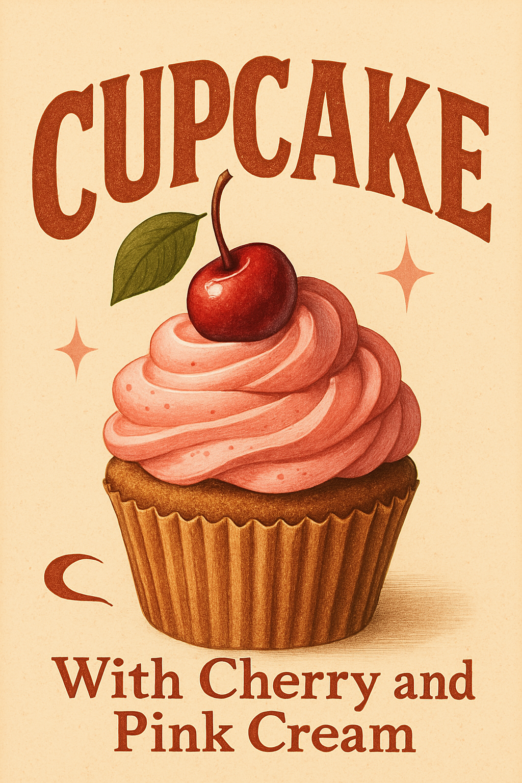 Charming vintage-style illustration of a cupcake topped with pink cream and a cherry, perfect for bakery branding or dessert menus.