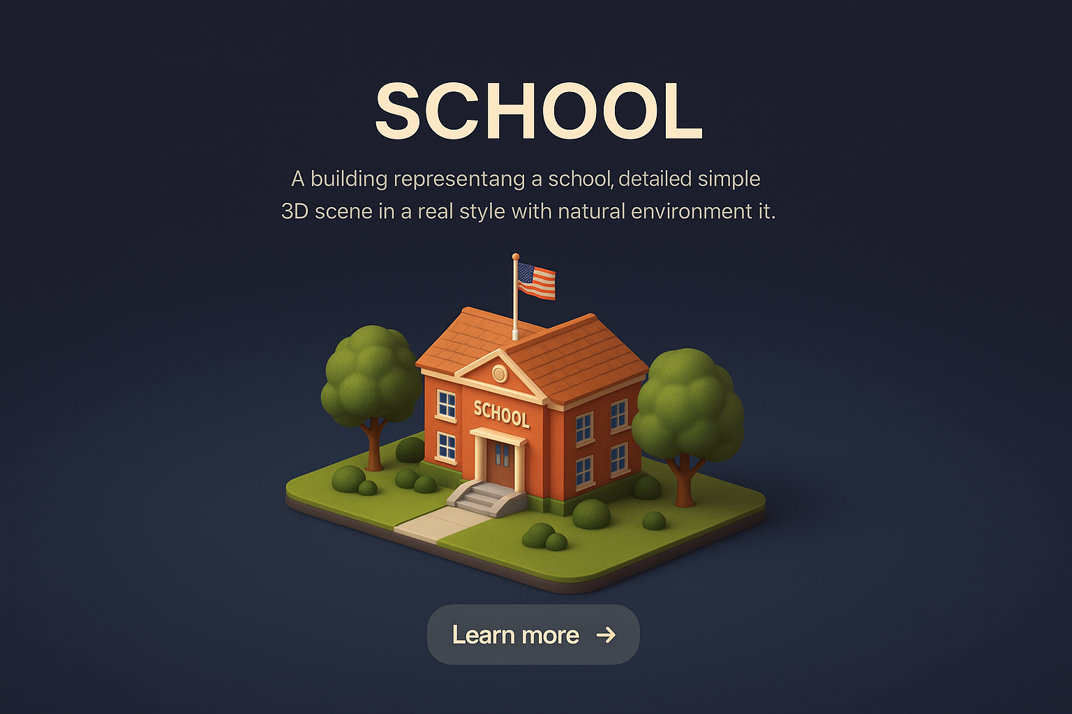 A detailed 3D illustration of a school building set against a dark gradient background. The scene includes trees and a flag, emphasizing realism and a cohesive design.