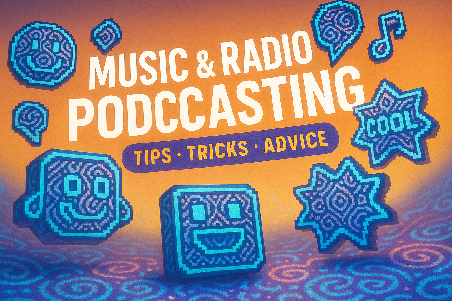 /Collection: /by davooda/Type: PNG/Vibrant social media graphic designed for podcasting guidance, featuring playful pixel art icons and a dynamic color palette. Ideal for engaging content on digital platforms.
