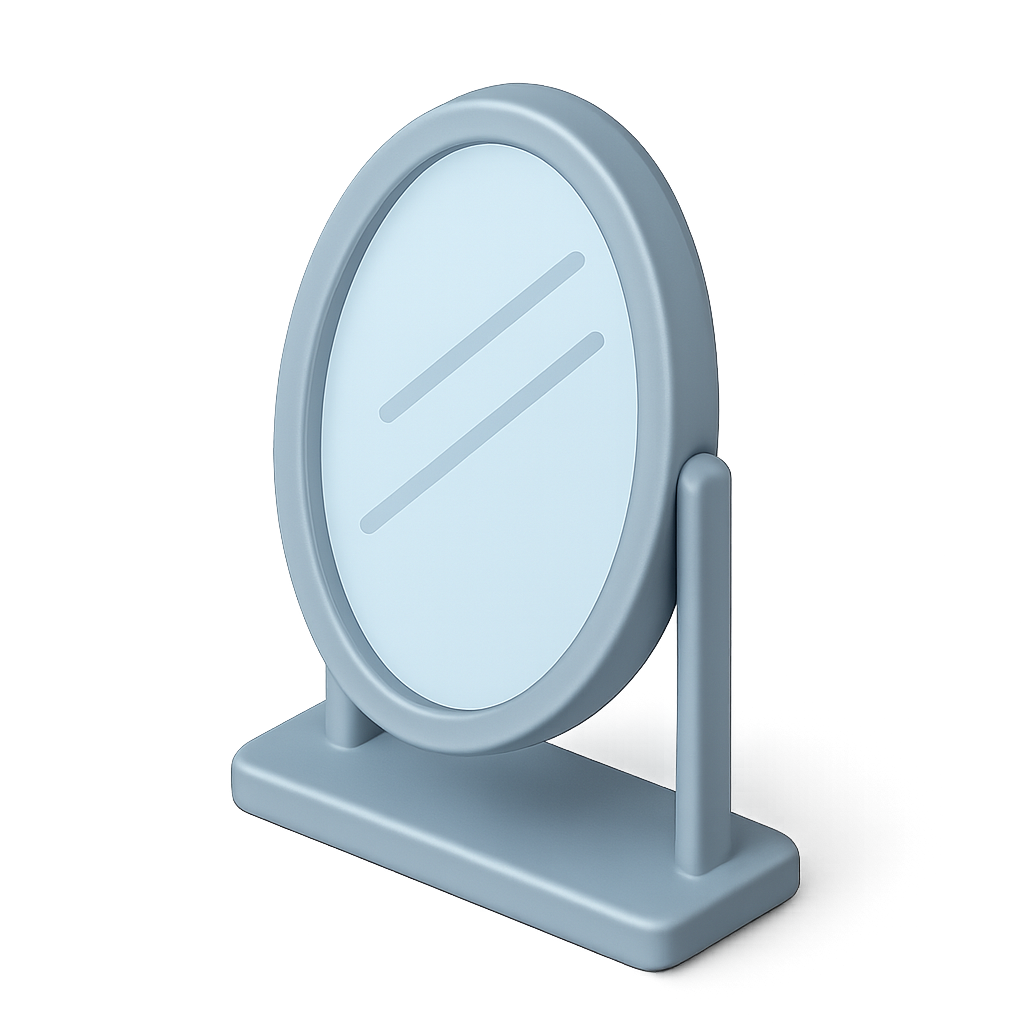 A sleek 3D icon of a mirror displayed in a three-quarter view. The design features a smooth, rounded frame and a stand, showcasing a soft color palette and a volumetric look.