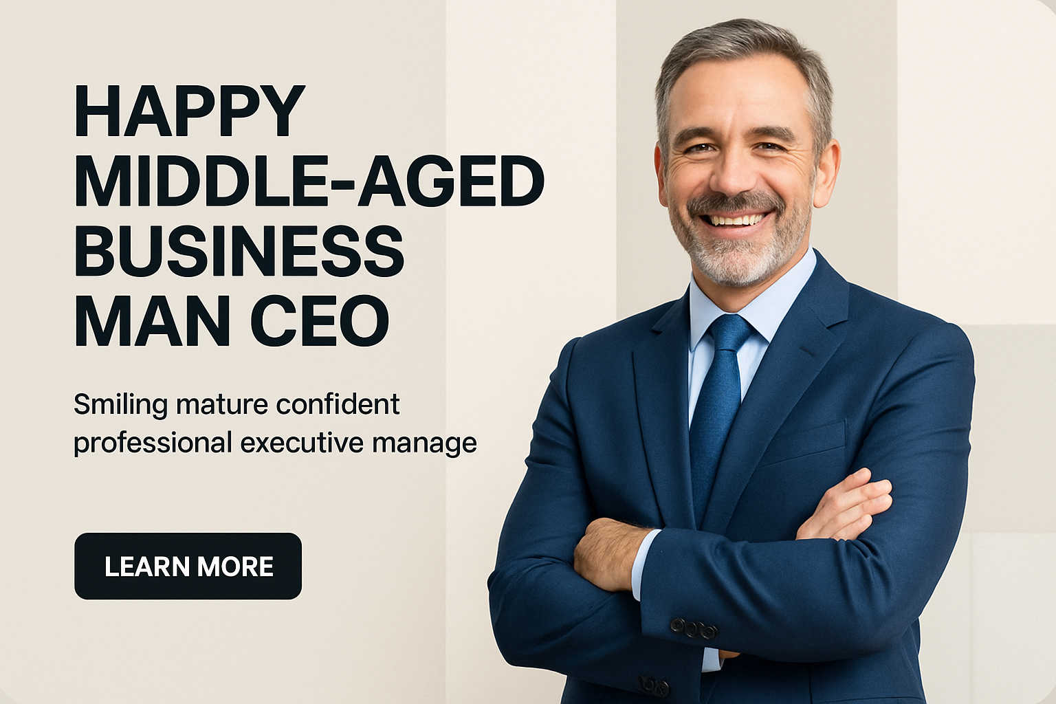 A smiling middle-aged businessman stands confidently in an office, arms crossed, wearing a blue suit. The modern background features geometric shapes, enhancing the professional atmosphere.