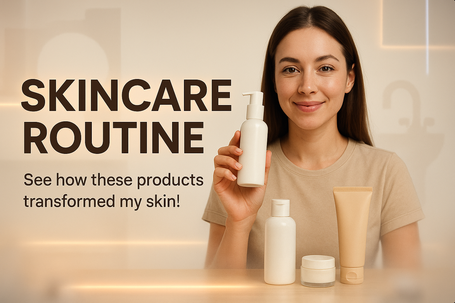 /Collection: /by davooda/Type: PNG/Inviting skincare routine promotional image showcasing a smiling individual holding various skincare products, perfect for beauty and wellness marketing.