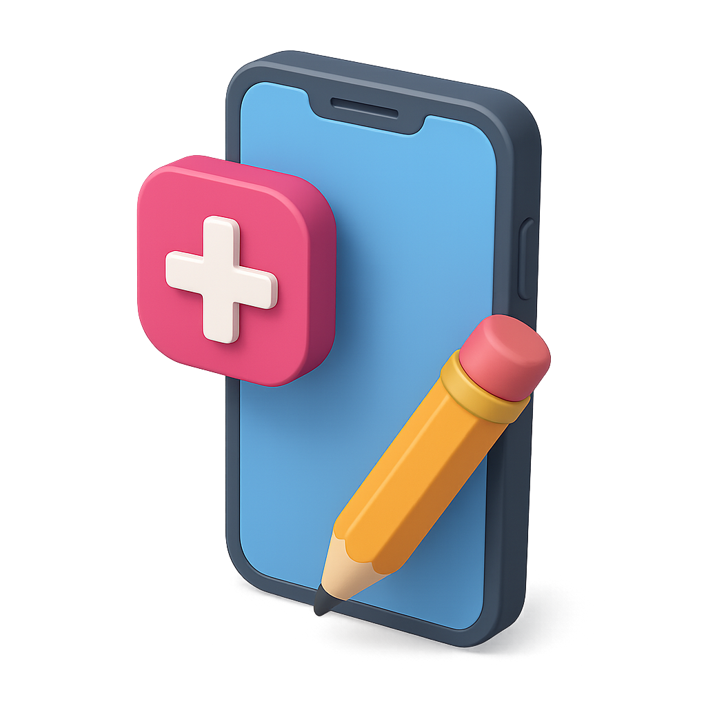 /Collection: /by davooda/Type: PNG/A vibrant 3D mobile app icon featuring a smartphone with a blue screen, a pink plus symbol, and a pencil. The design showcases an isometric view with a transparent background, creating a modern and dynamic visual.