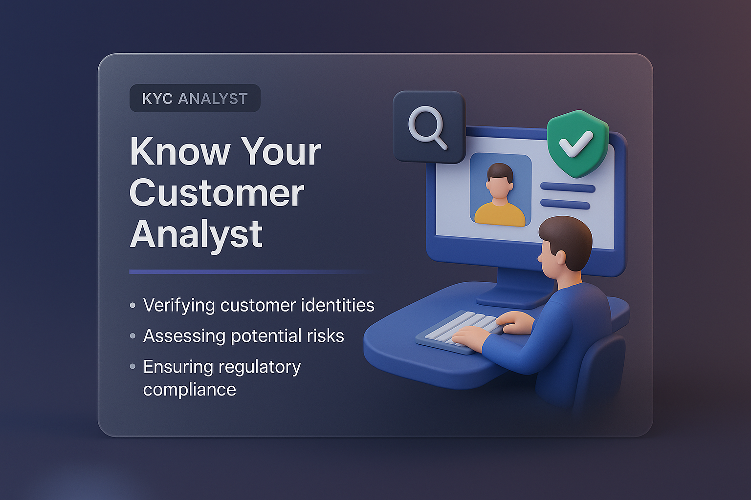 /Collection: /by davooda/Type: PNG/A 3D illustration showcasing a KYC analyst at a computer, verifying customer identities. The design features a dark panel with icons, emphasizing compliance and risk assessment.