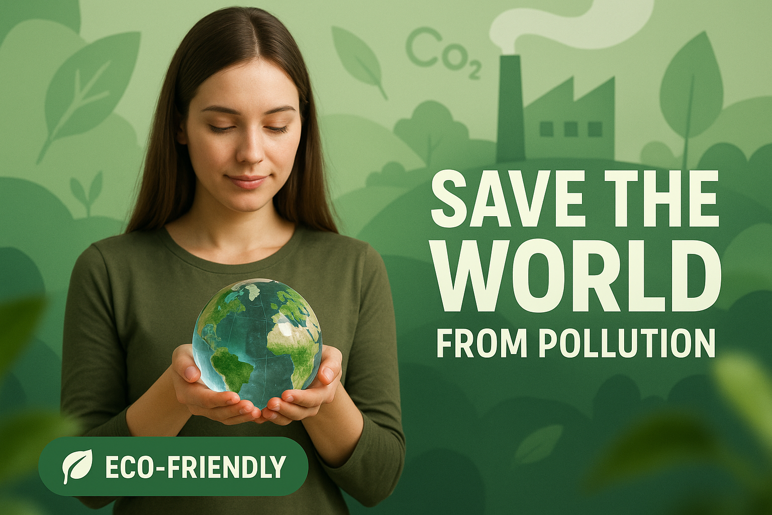 /Collection: /by davooda/Type: PNG/Engaging promotional graphic showcasing a woman holding a globe, emphasizing environmental awareness and pollution reduction. Ideal for sustainability campaigns or social media posts.