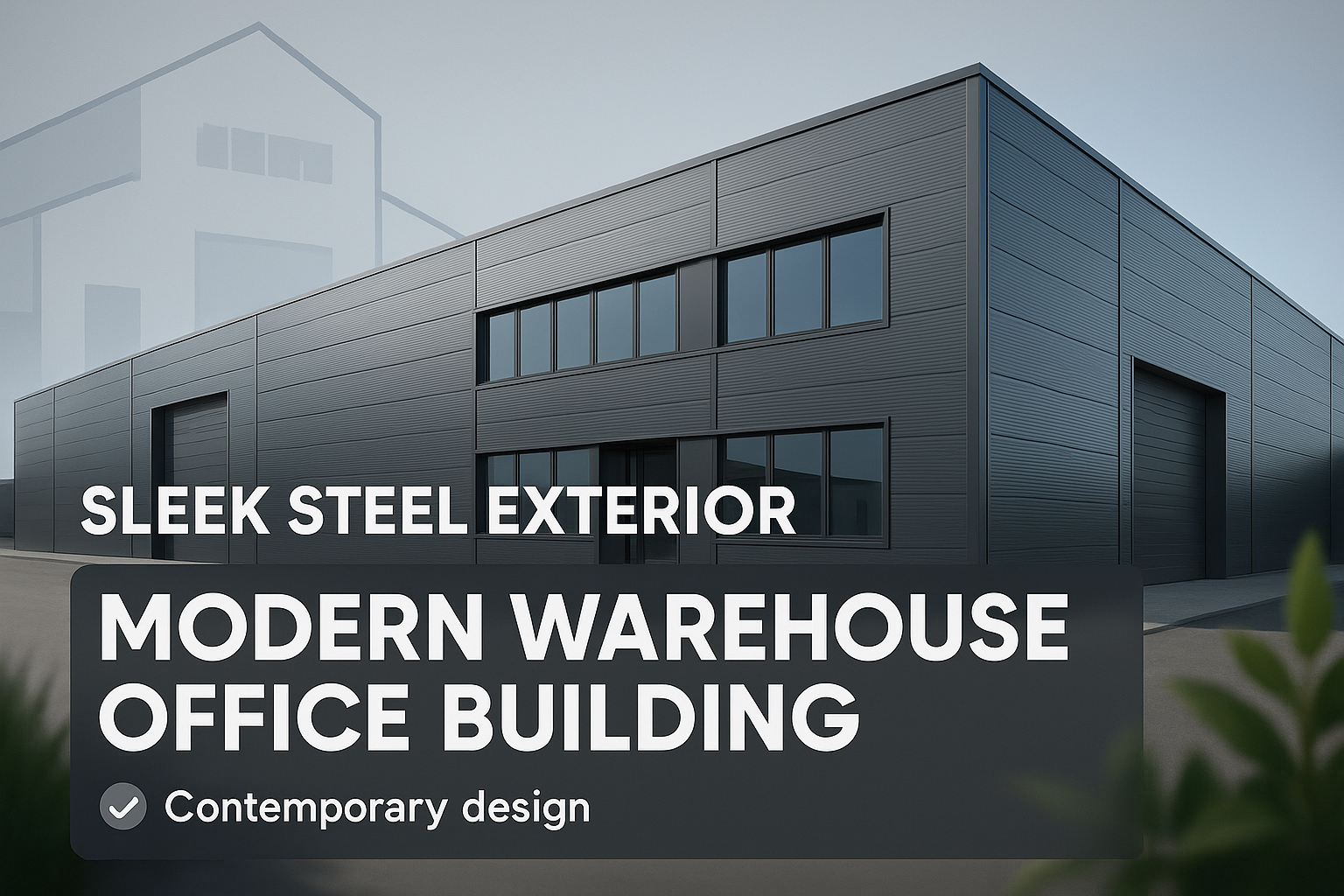 Photorealistic image showcasing a sleek steel exterior of a modern warehouse office building, ideal for architectural presentations and real estate marketing.