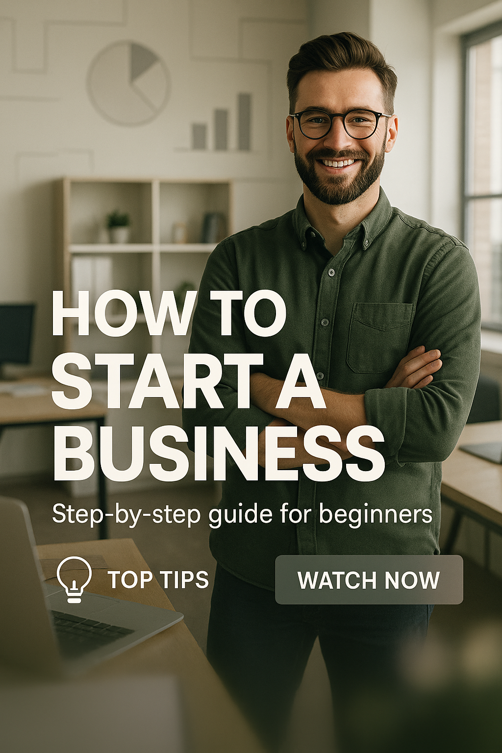 Promotional image for a step-by-step business guide featuring a confident individual in a professional setting. Ideal for online courses and tutorials aimed at aspiring entrepreneurs.